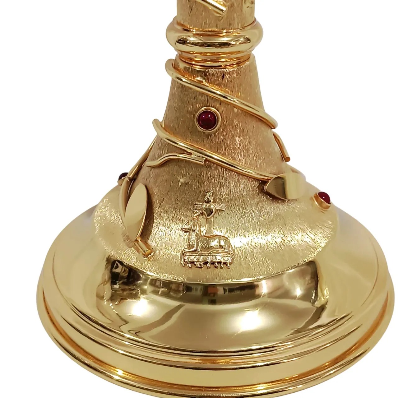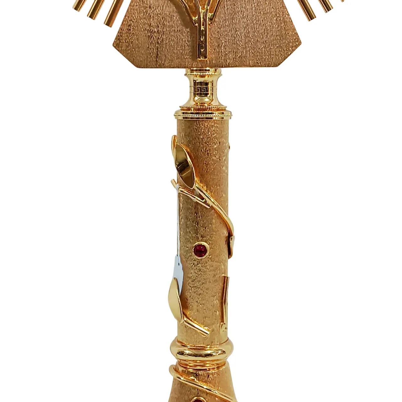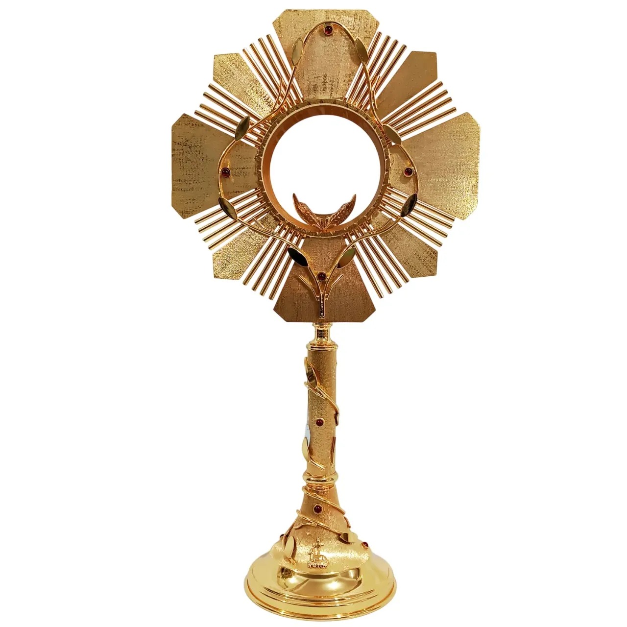 Belissímo ostensório em estilo arrojado. Possui acabamento polido e fosco, bem como ramos de oliveira, o que confere algo único a essa peça.