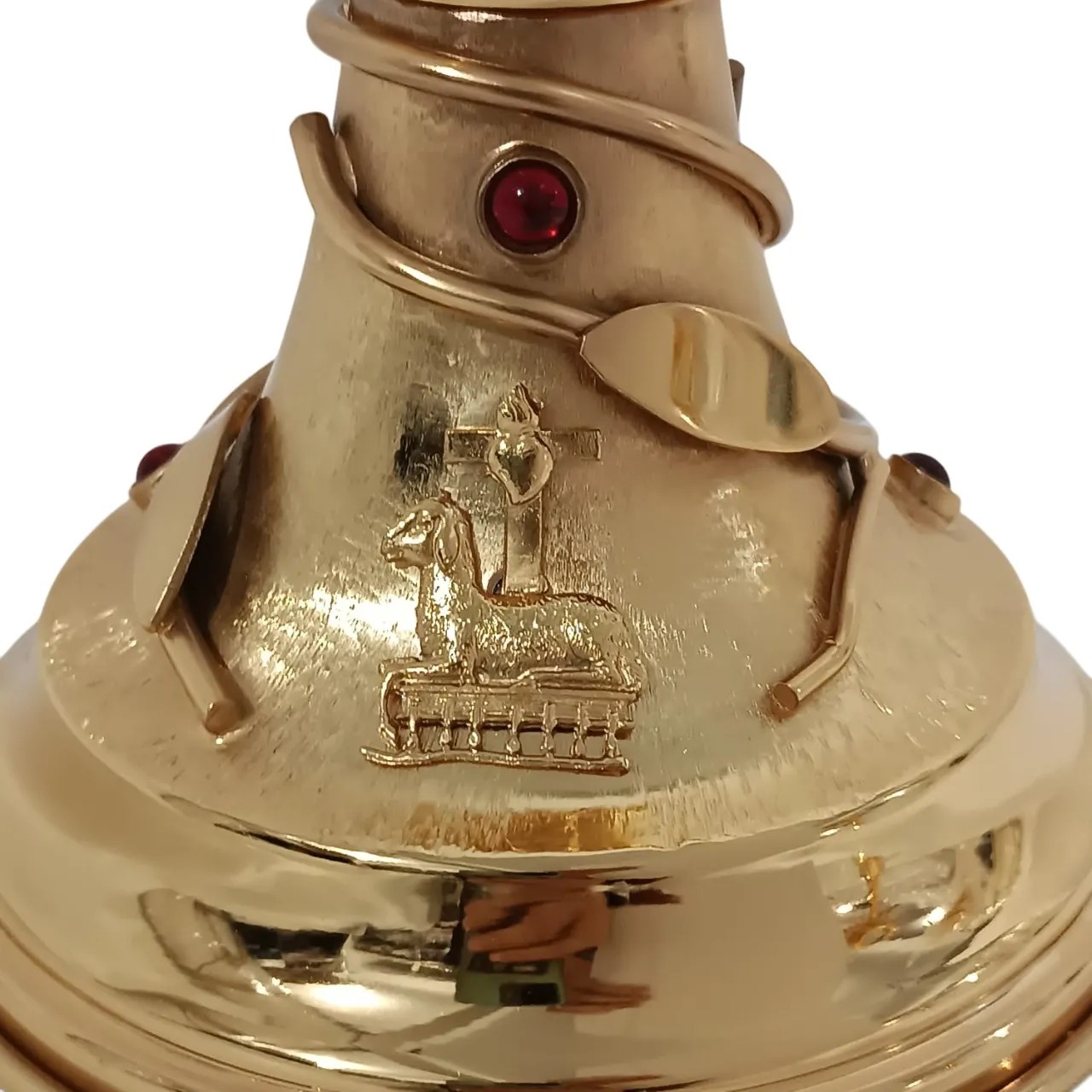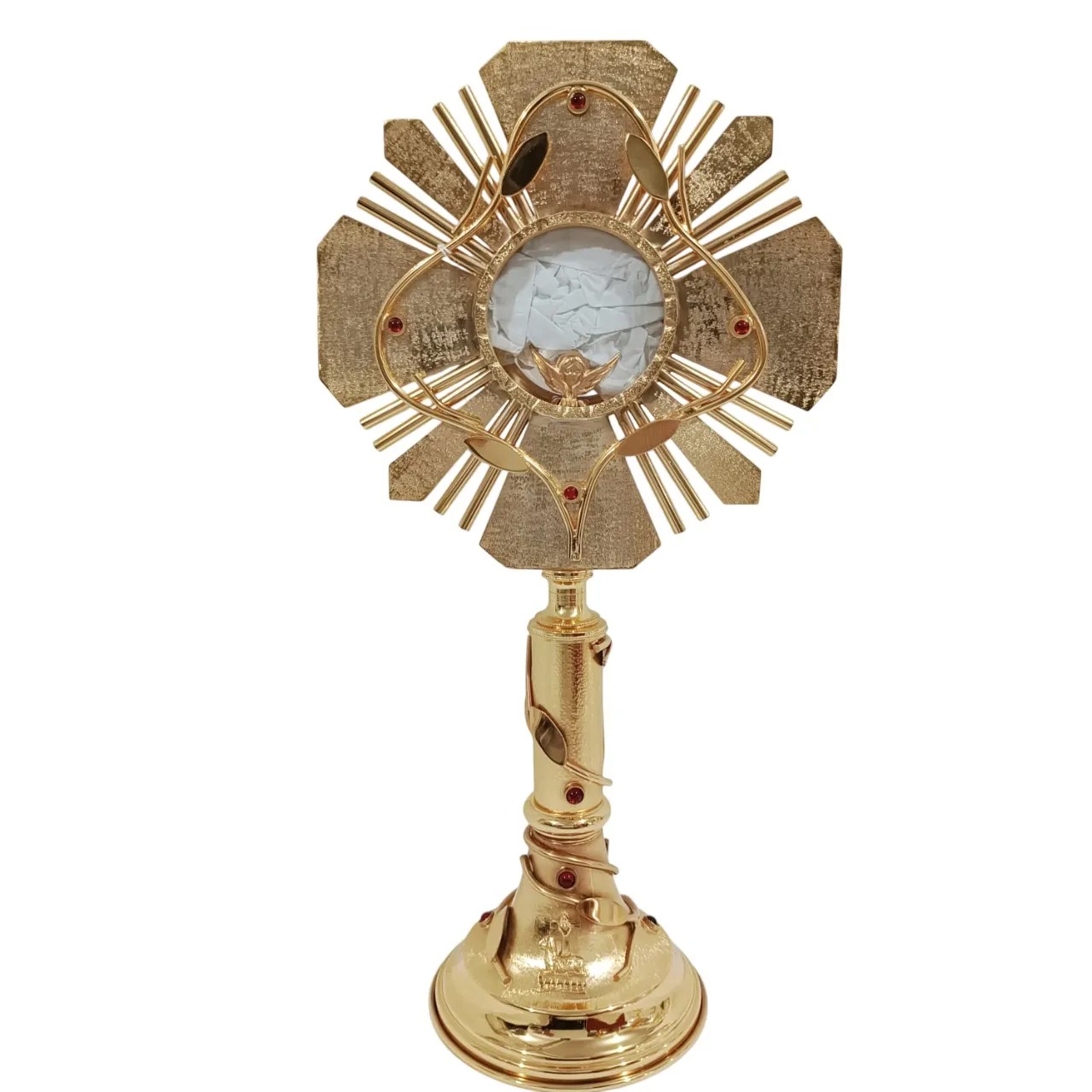 Belissímo ostensório em estilo arrojado. Possui acabamento polido e fosco, bem como ramos de oliveira, o que confere algo único a essa peça.