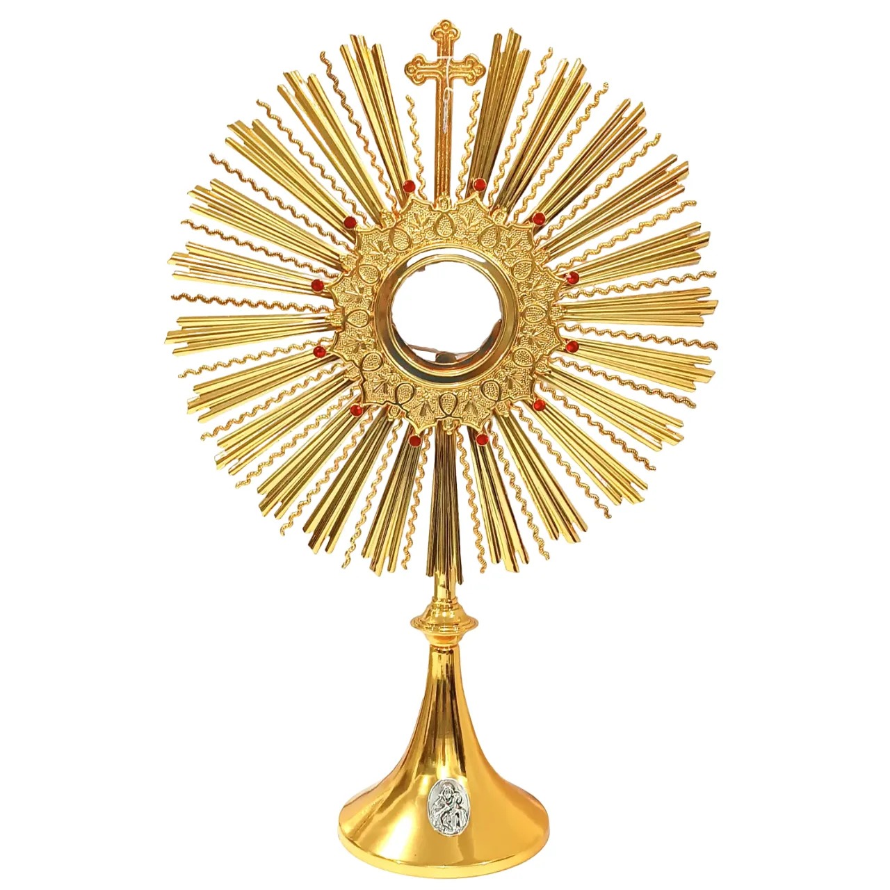 Ostensório OS011. Produzido em metal, com banho dourado. Aplicação de pedras semipreciosas. Para hóstia de 8cm.