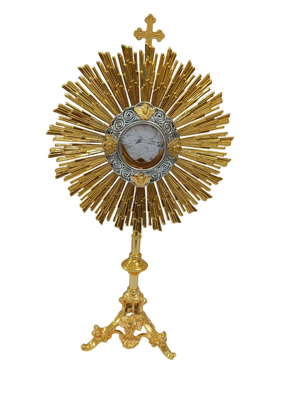 Ostensório OS012. Produzido em metal, com banho dourado. Aplicação de pedras semipreciosas. Para hóstia de 8cm.