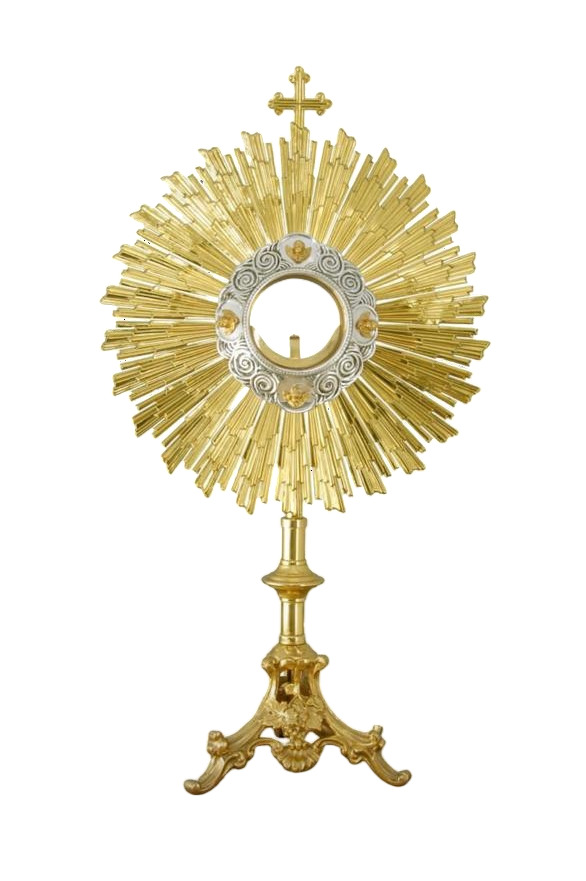 Ostensório OS012. Produzido em metal, com banho dourado. Aplicação de pedras semipreciosas. Para hóstia de 8cm.