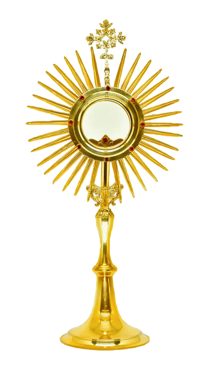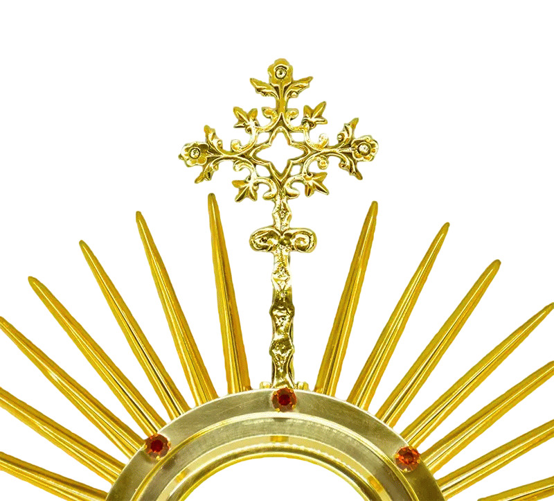 Fabricado em metal com banho dourado e aplique de strass vermelho. Acompanha luneta para hóstia de 8 cm.