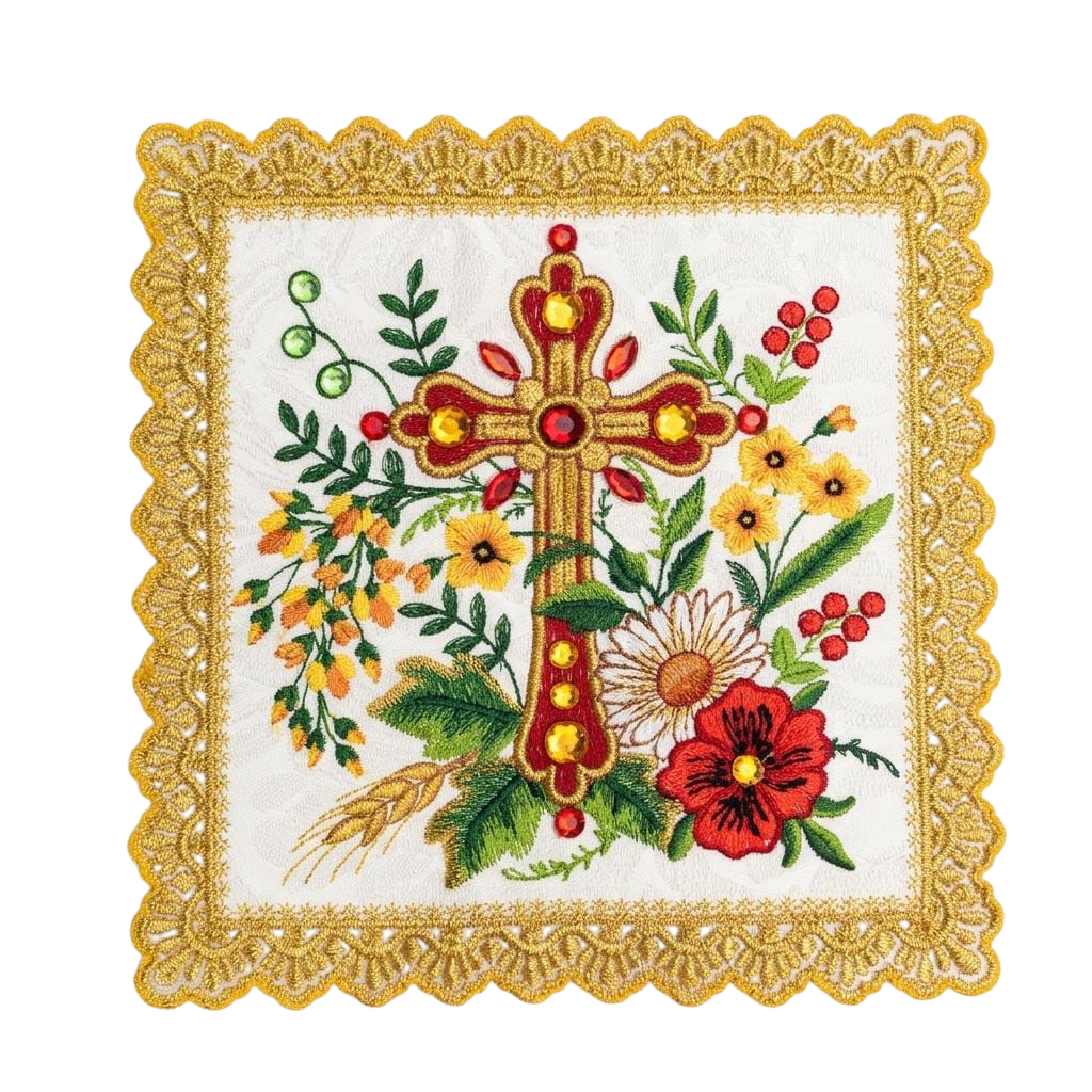 Pala litúrgica ricamente confeccionada, destacando-se pela exuberância de seus bordados e pela aplicação refinada de pedrarias que conferem brilho, profundidade e nobreza à peça. Ao centro, a cruz ornamentada em tons dourado e vermelho simboliza a fé e o sacrifício de Cristo, sendo delicadamente enriquecida com pedras aplicadas que captam a luz e valorizam ainda mais o desenho.