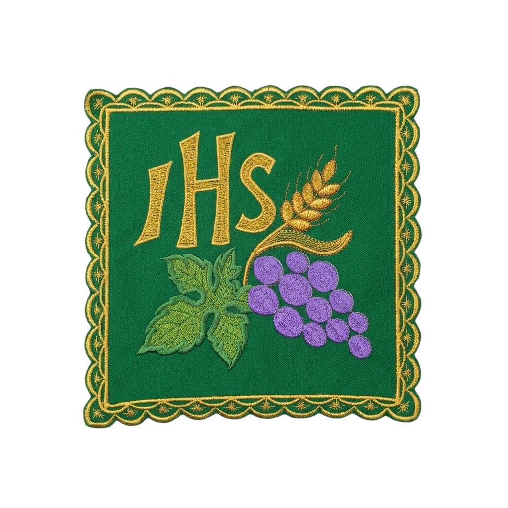 Ao centro, destaca-se o tradicional símbolo “IHS”, finamente bordado em fios dourados, representando o Santíssimo Nome de Jesus. A composição é enriquecida com delicados elementos eucarísticos: o cacho de uvas e o ramo de trigo, símbolos do vinho e do pão, que remetem diretamente ao mistério da Eucaristia.
