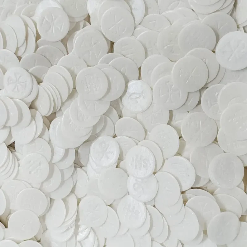 Hóstia Partícula 4,0 cm para o fiel – são as partículas mais vendidas por nós. São as maiores partículas que fabricamos. Dessa maneira são ideais para serem usada na comunhão sob duas espécies. Por isso nossos conjunto comunhão de duas especies são ideias para isso. A Fábrica de Hóstias Nossa Senhora de Fátima, produz hóstias (utilizadas pelo padre) e partículas (utilizadas para serem distribuídas aos fiéis), desde 1995.