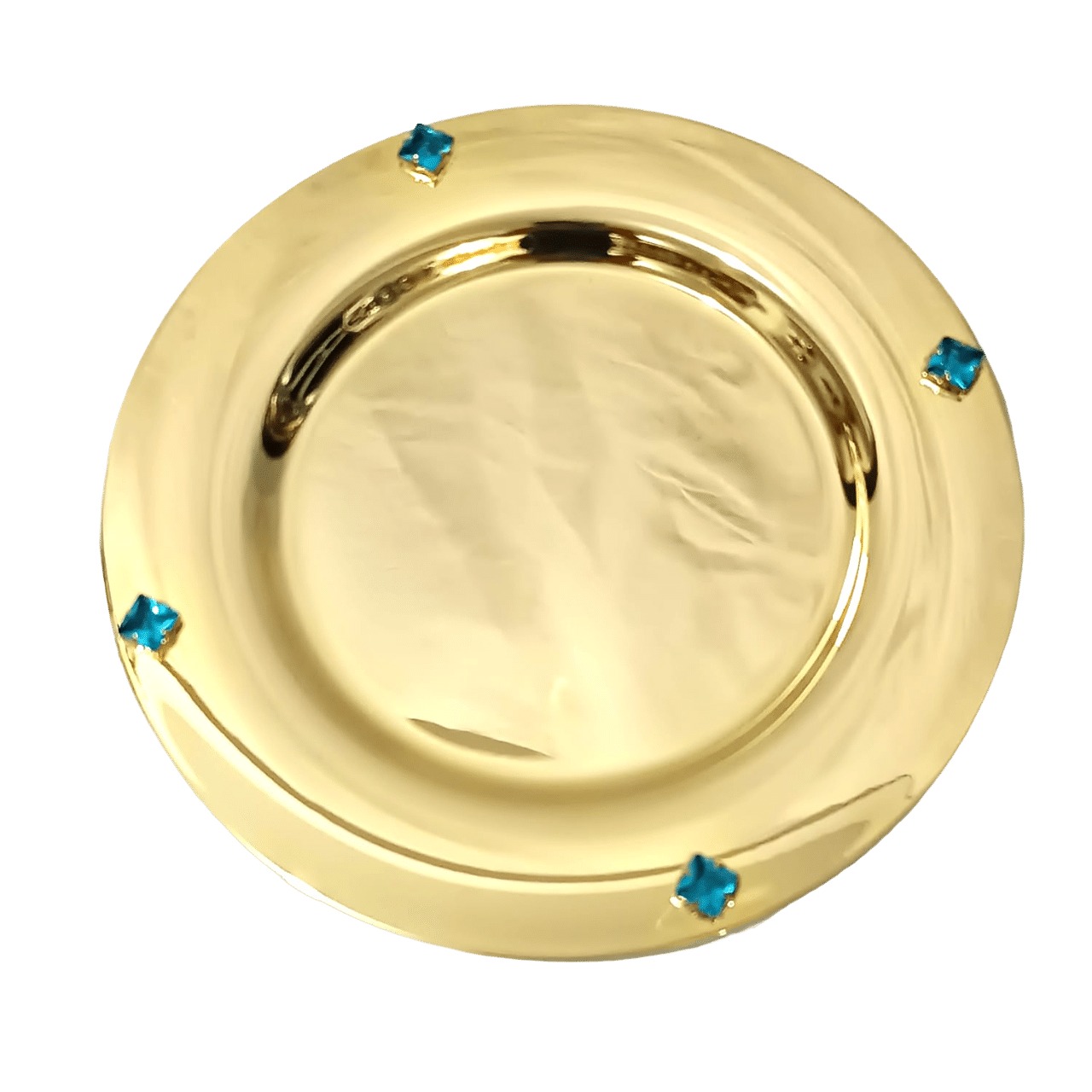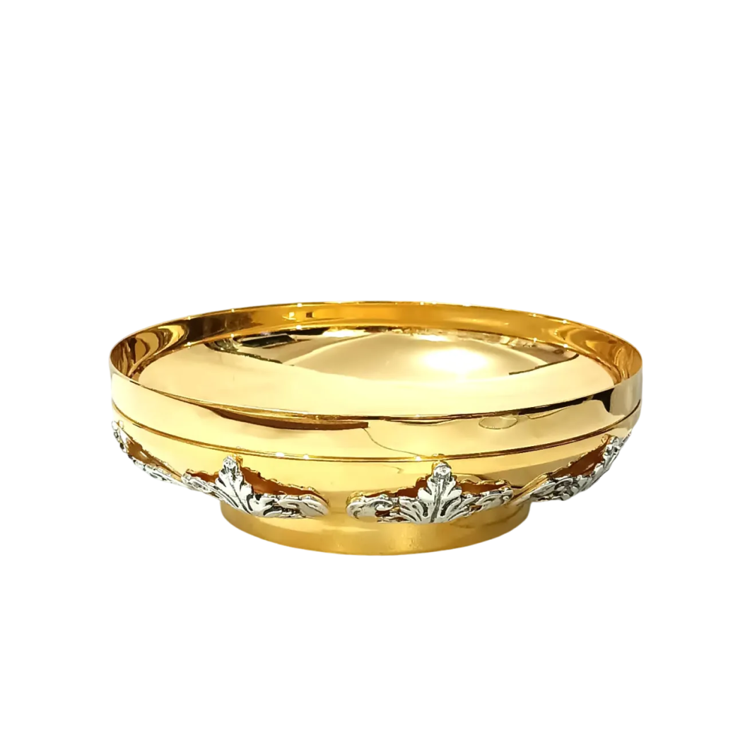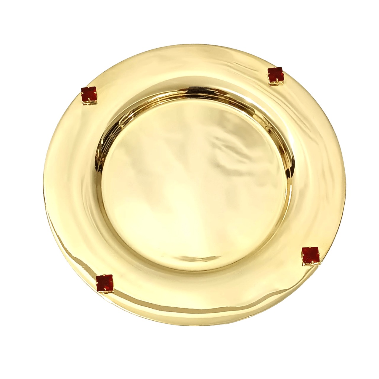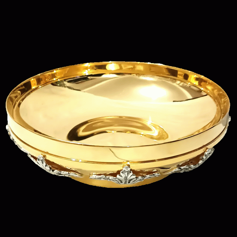 Patena de Comunhão italiana feita em latão banhado a níquel, com cabo de madeira. Polimento especial
