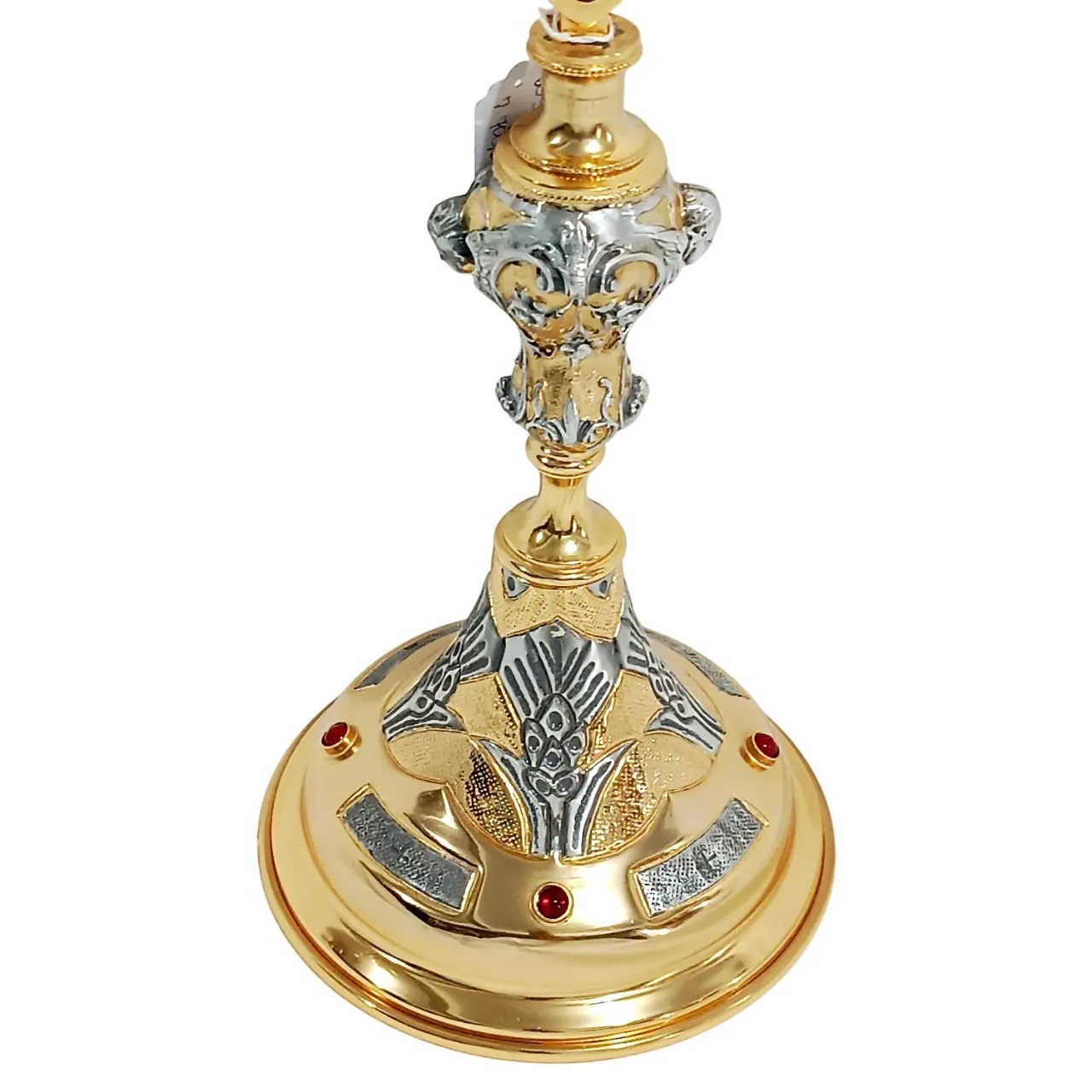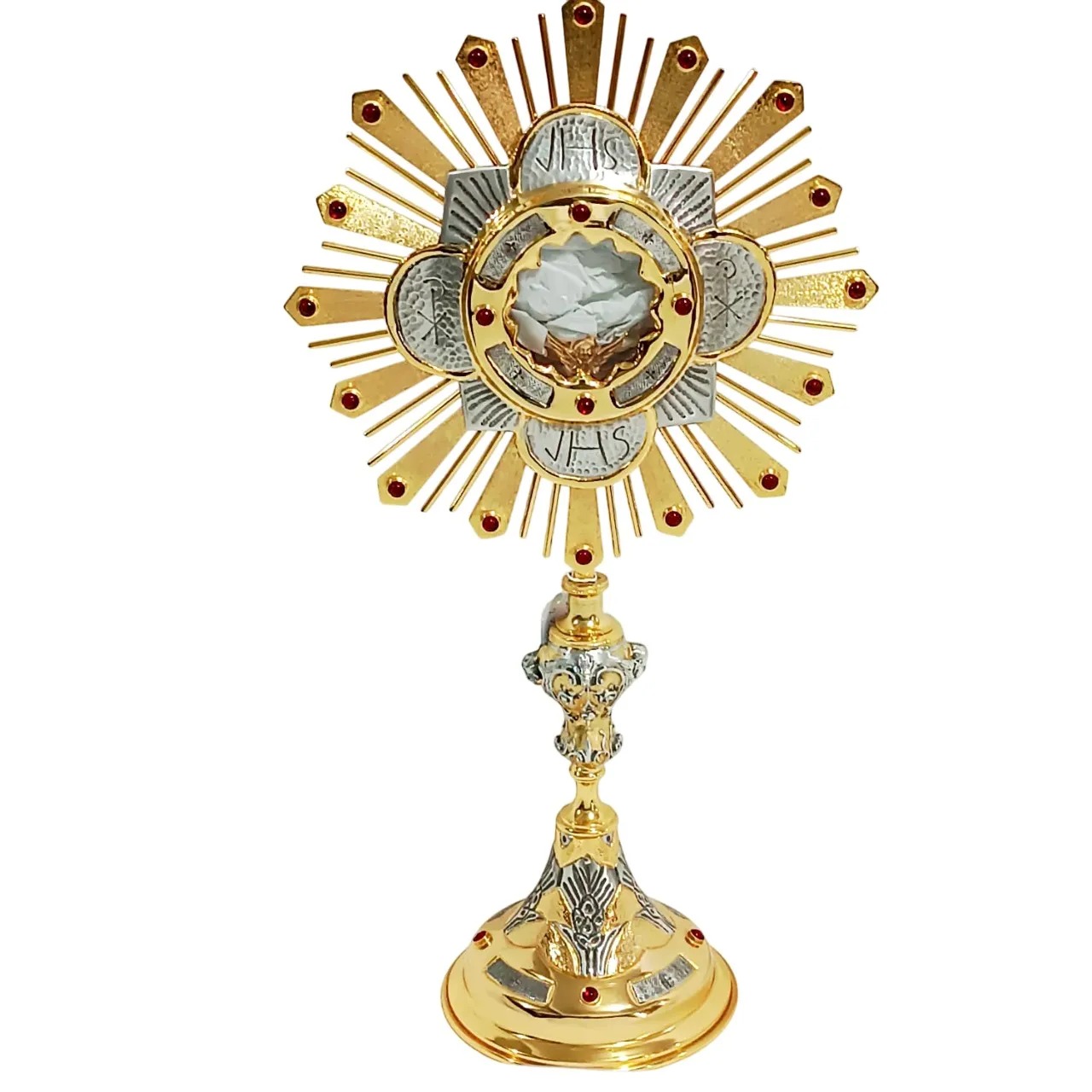 Ostensório italiano confeccionado em metal de alta qualidade, com acabamento em banho de ouro e prata. Peça cinzelada à mão, com ricos detalhes artísticos e aplicações de pedras em tom rubi, que ressaltam sua beleza e solenidade.