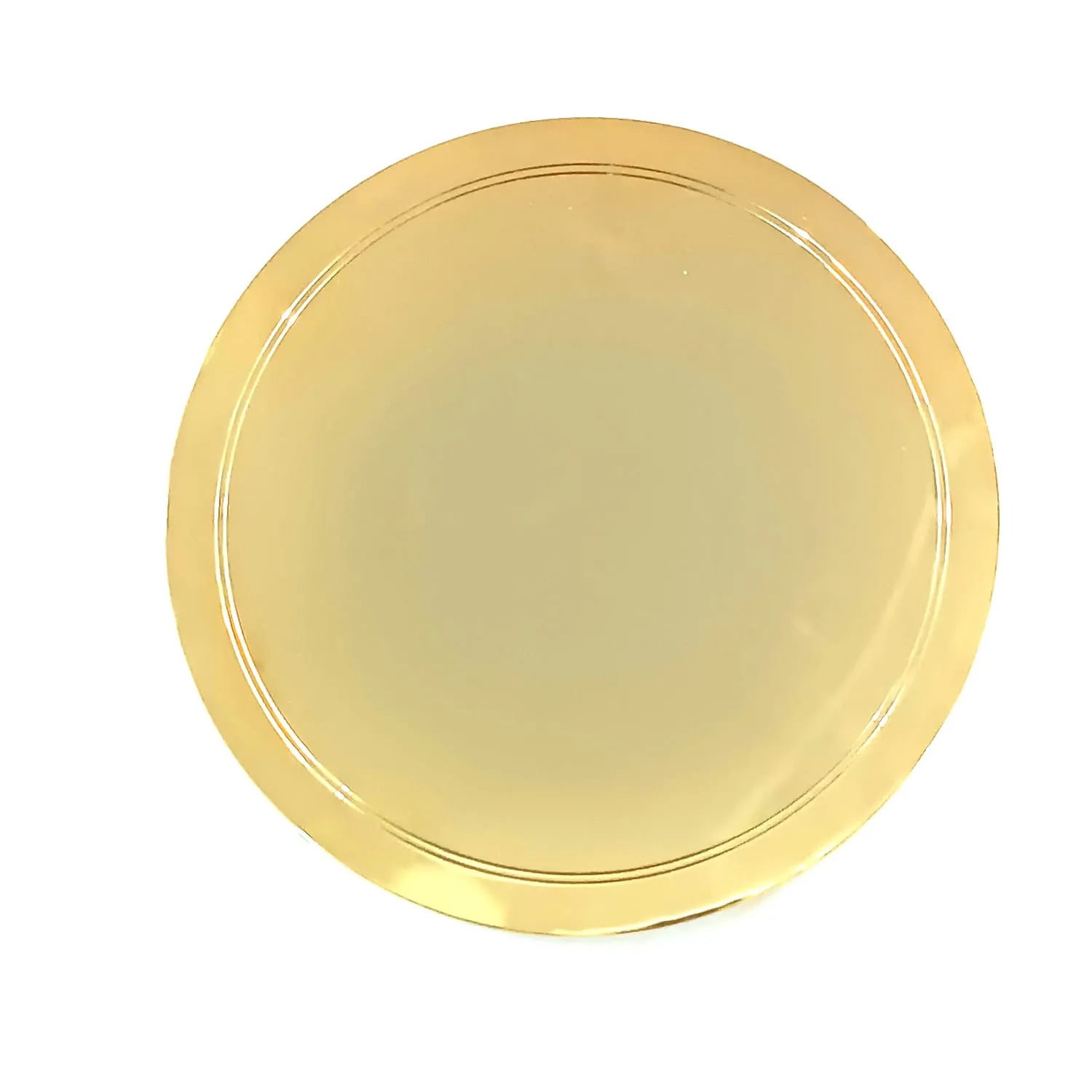 Patena em latão, banhada a ouro 18k. Levemente abaulada e com dois círculos na borda de fora.