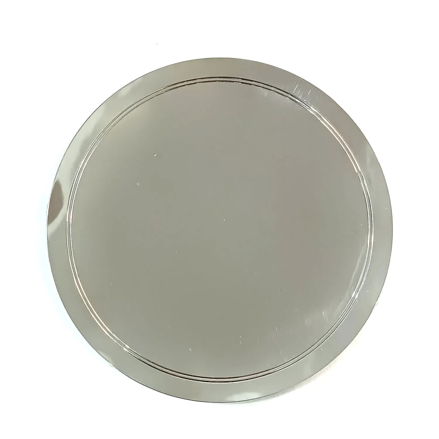 Patena em latão, banhada a níquel. Levemente abaulada e com dois círculos na borda de fora.