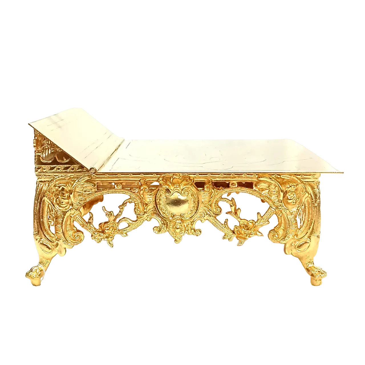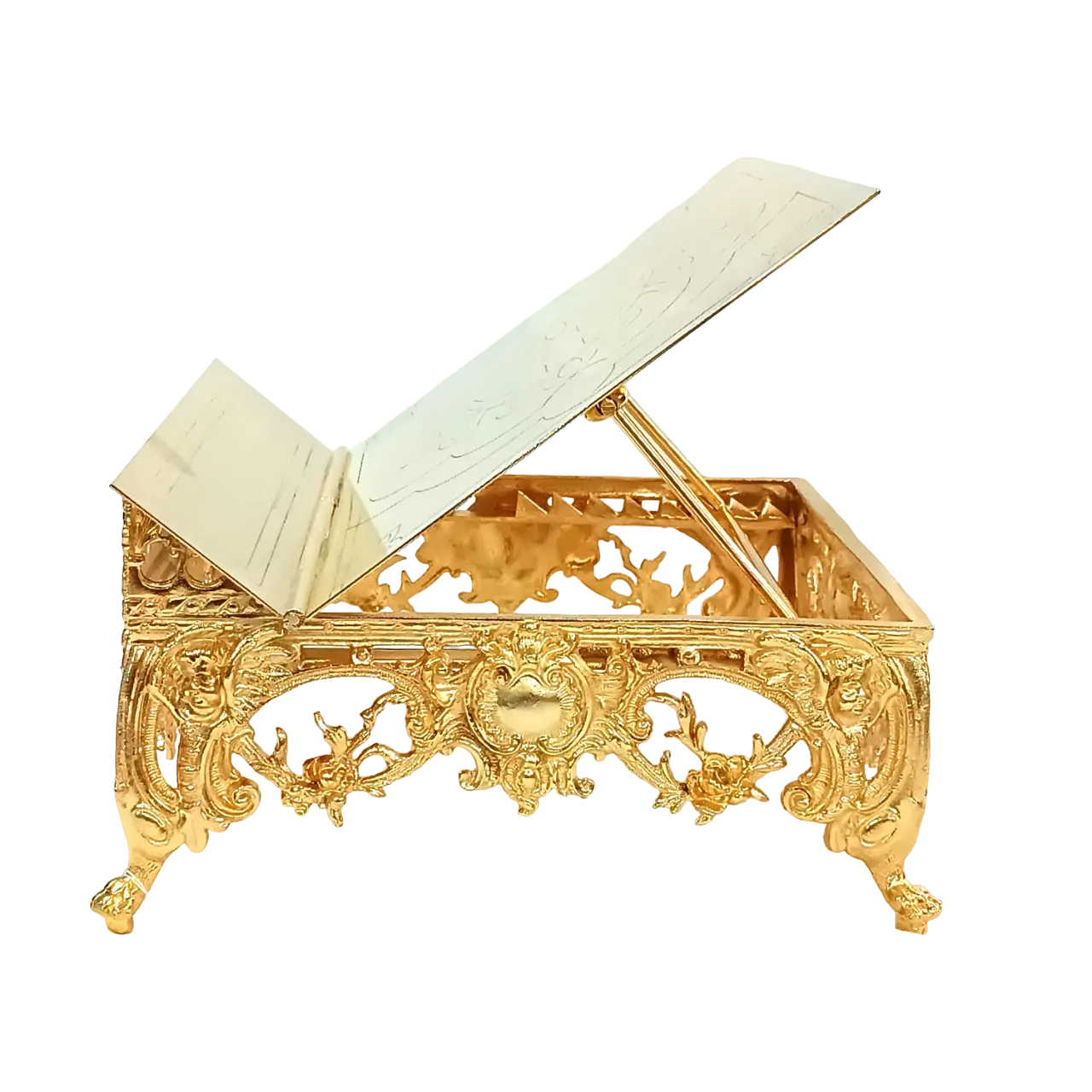 Suporte para missal fabricado em metal com banho de ouro 24k, tendo mais brilho e beleza. Recebe na frente uma gravura em algo relevo, e possui oito opções de altura do suporte do Livro.