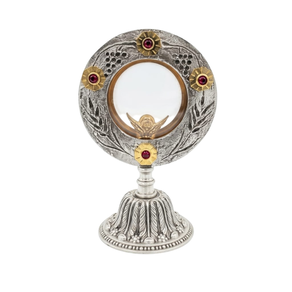 Confeccionado em metal com acabamento niquelado, o relicário apresenta estrutura robusta e elegante. Seu formato circular remete à eternidade e à perfeição divina, enquanto o visor central em vidro permite a adequada exposição da relíquia. A peça é ornamentada com aplicações douradas e pedras em tom vermelho, que destacam ainda mais sua nobreza e valor simbólico.