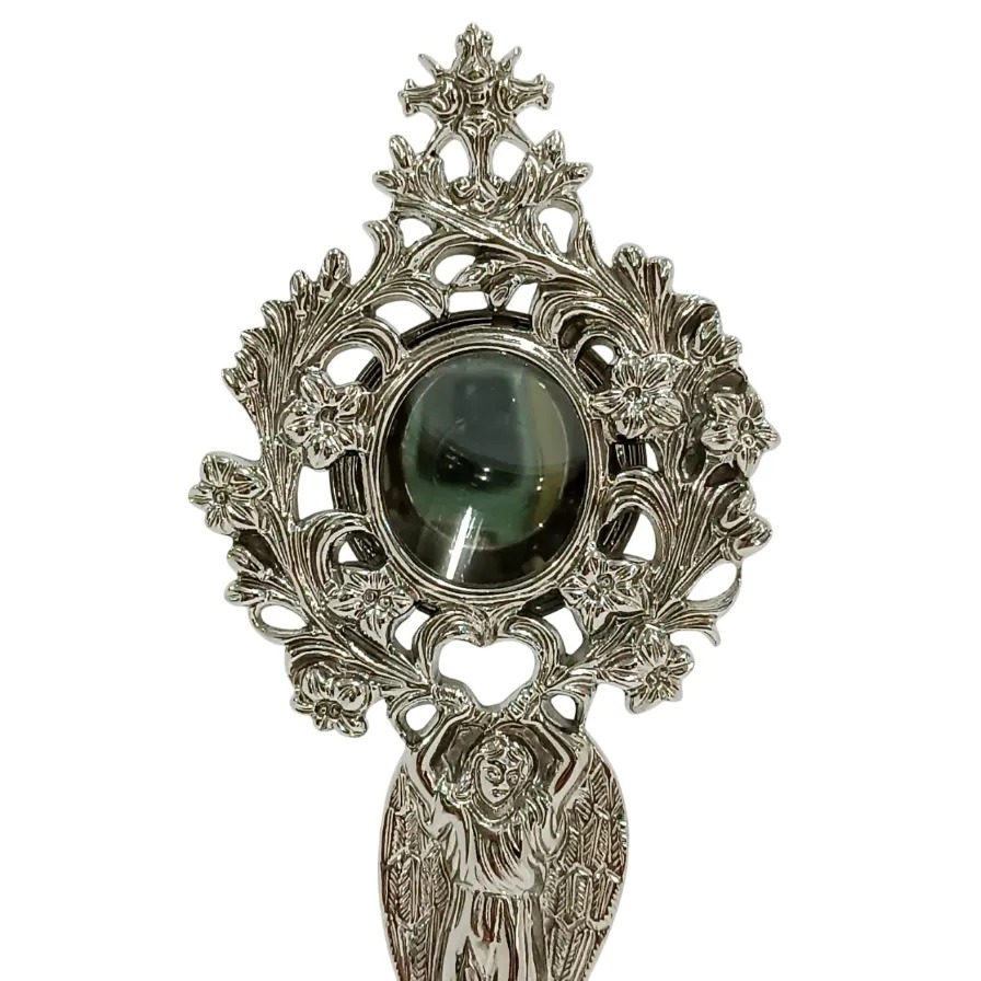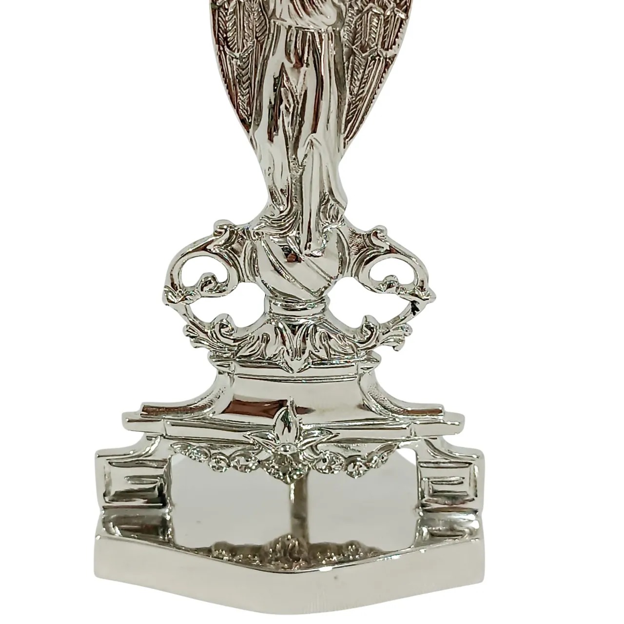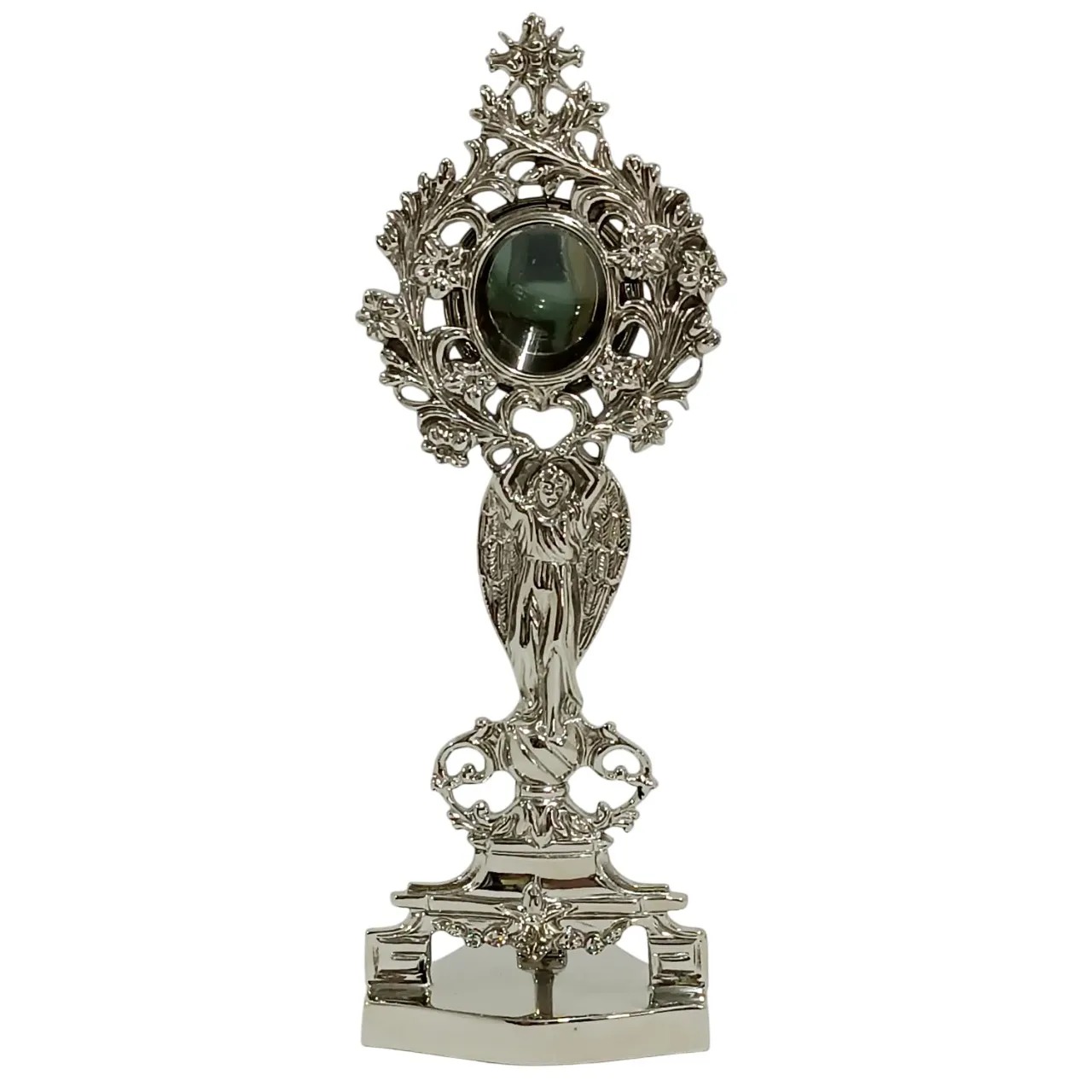 A peça possui um design clássico e elegante, destacando-se pela ornamentação e pela tonalidade prateada do níquel, ideal para exposição e veneração de relíquias sagradas.
