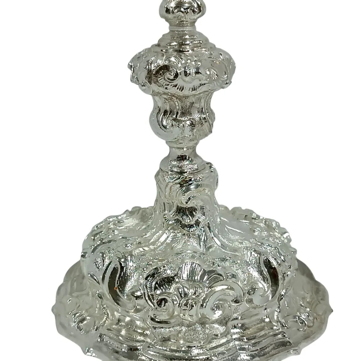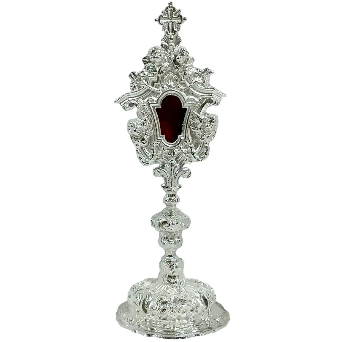 A peça possui um design barroco e elegante, destacando-se pela ornamentação e pela tonalidade prateada do níquel, ideal para exposição e veneração de relíquias sagradas. É uma peça riquíssima em detalhes, como toda peça barroca, além de tamanho considerável.