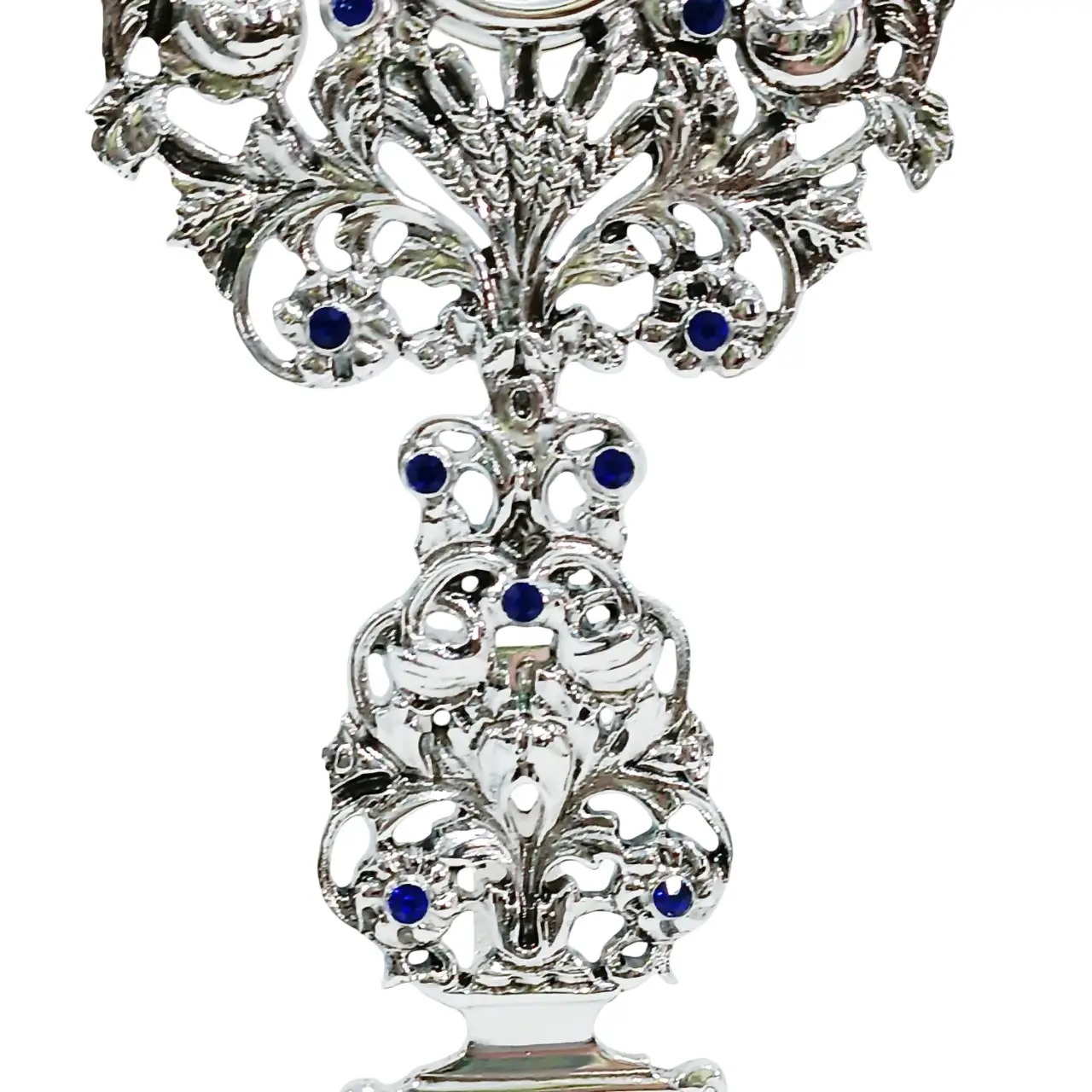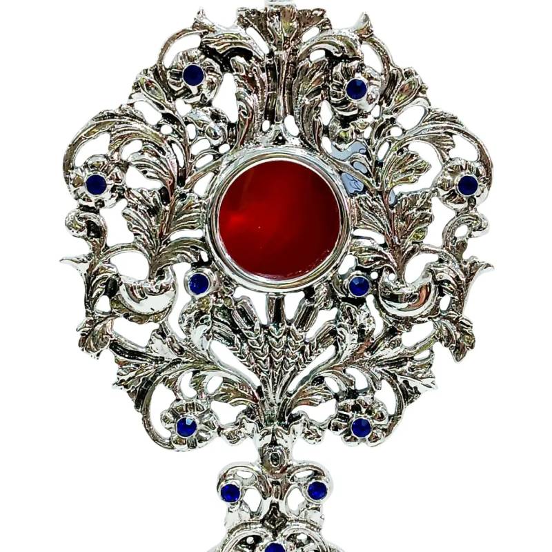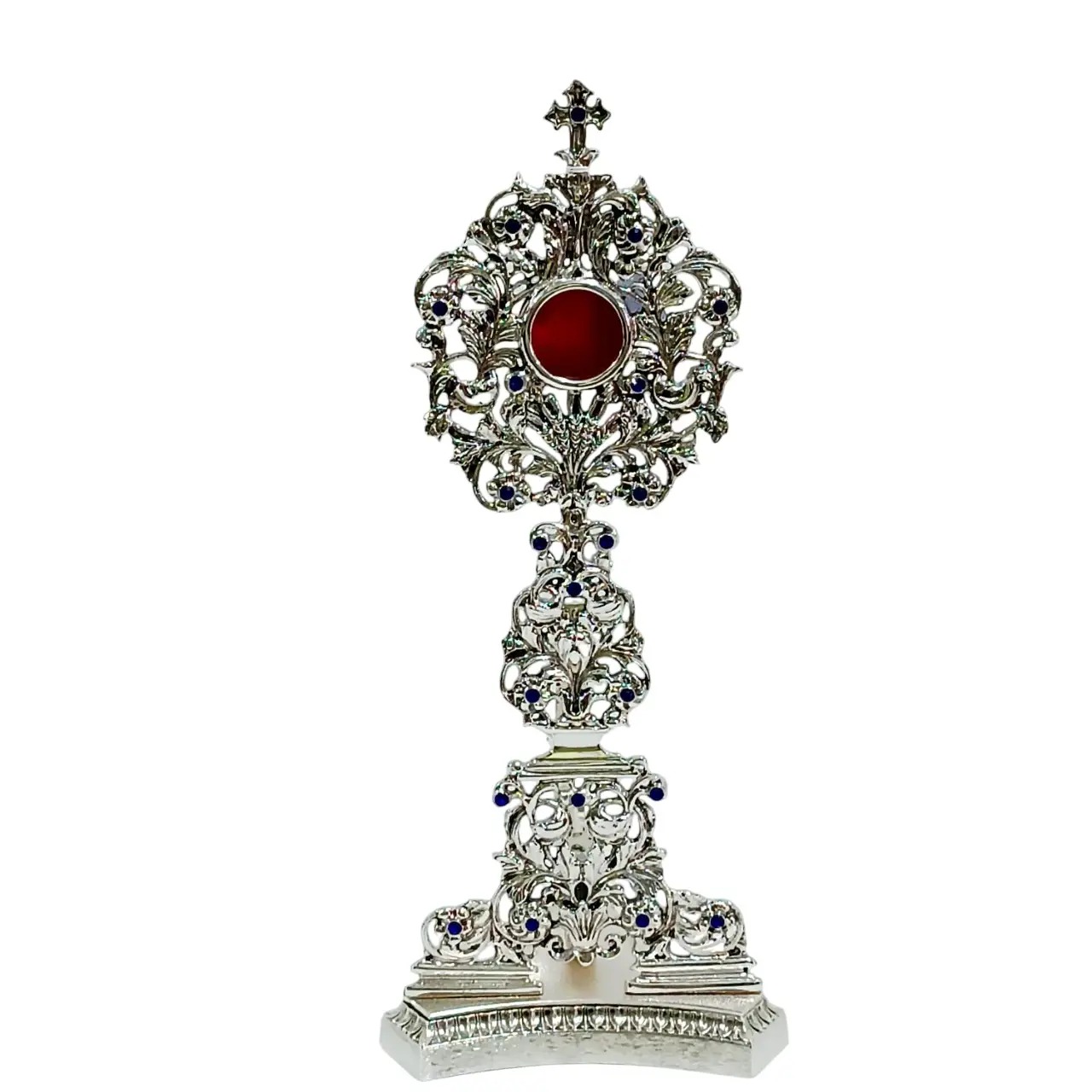 A peça possui um design clássico e elegante, destacando-se pela ornamentação e pela tonalidade prateada, ideal para exposição e veneração de relíquias sagradas.