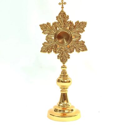 O Relicário Catedral é produzido na Itália, confeccionado em metal fundido com banho de níquel, que proporciona brilho, resistência e longa durabilidade. Estrutura artisticamente trabalhada, com detalhes finos na base e na coroa que sustenta a teca. Em estilo barroco.