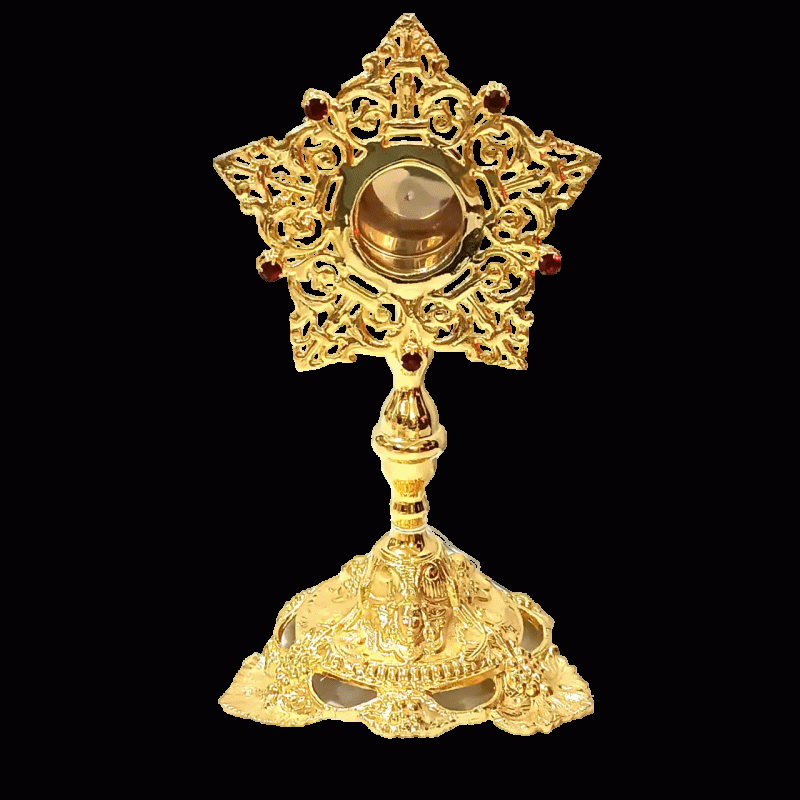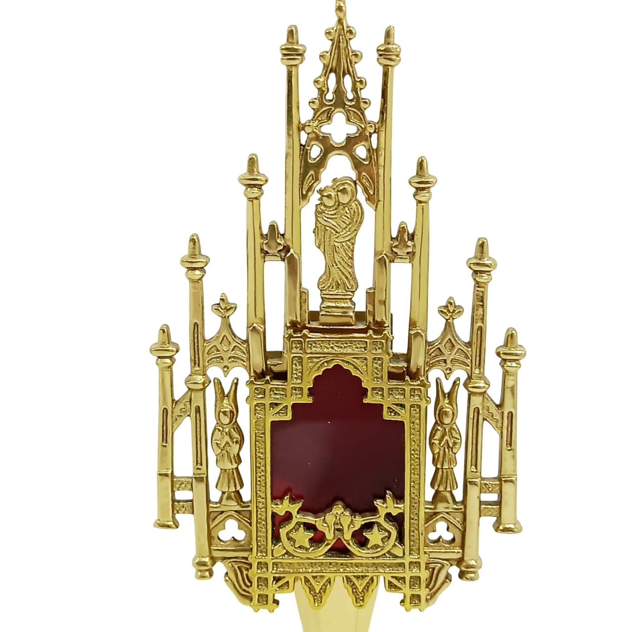 Elegante relicário litúrgico confeccionado em metal com banho dourado e acabamento brilhante. O Relicário Neogótico Prata apresenta pequenas torres, caracteristicas do estilo gótico, que enriquecem a peça com beleza e simbolismo.