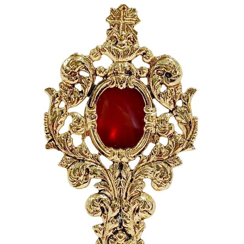 Inteiramente trabalhado à mão, é uma peça de grande riqueza de detalhes, ideal para a guarda e veneração de relíquias sagradas.