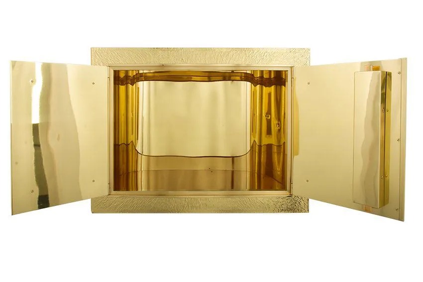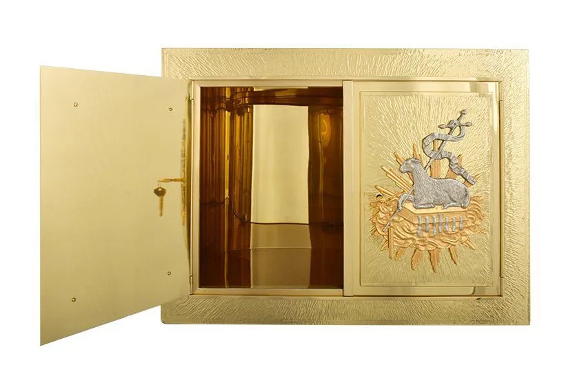 O Sacrário Cálice e Cordeiro Embutir 10 é fabricado em latão com banho dourado. Possui aplicação de cálice e cordeiro nas portas e acompanha um par de chaves.