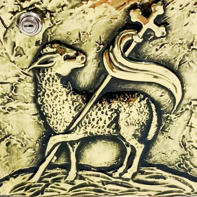 Tabernáculo litúrgico confeccionado em madeira de alta qualidade, com acabamento externo na porta em metal artístico trabalhado manualmente por artesãos especializados na tradicional técnica chilena de cinzelamento. A frente apresenta a figura do Cordeiro Pascal em relevo, símbolo de Cristo ressuscitado, agregando valor simbólico e estético à peça.