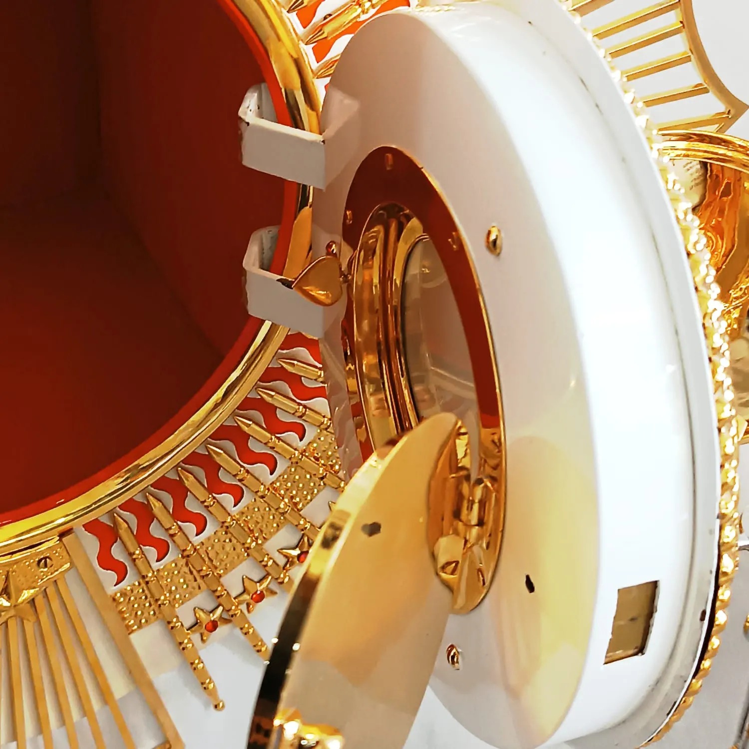 Solenidade e presença em uma só peça. Este belíssimo sacrário possui expositor central com porta para hóstia de até 10 cm, ideal para adoração permanente. Confeccionado em metal resistente, com banho de ouro de alto brilho, apresenta detalhes simbólicos esculpidos e acabamento em relevo, refletindo a grandeza do Santíssimo Sacramento. Detalhe de esmalte vermelho.