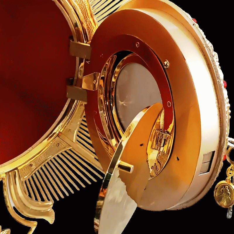 Solenidade e presença em uma só peça. Este belíssimo sacrário possui expositor central com porta para hóstia de até 10 cm, ideal para adoração permanente. Confeccionado em metal resistente, com banho de ouro de alto brilho, apresenta detalhes simbólicos esculpidos e acabamento em relevo, refletindo a grandeza do Santíssimo Sacramento.