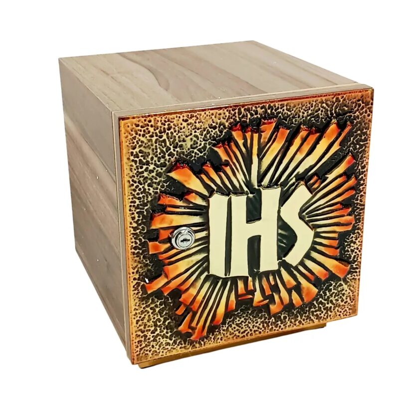 Belissímo sacrário em metal com luz indicadora da presença do Santíssimo