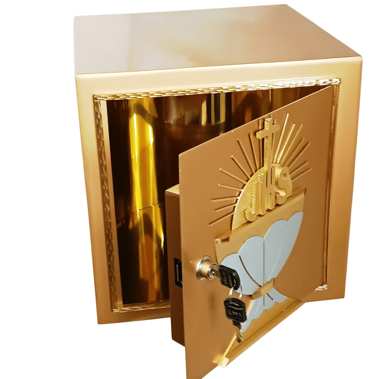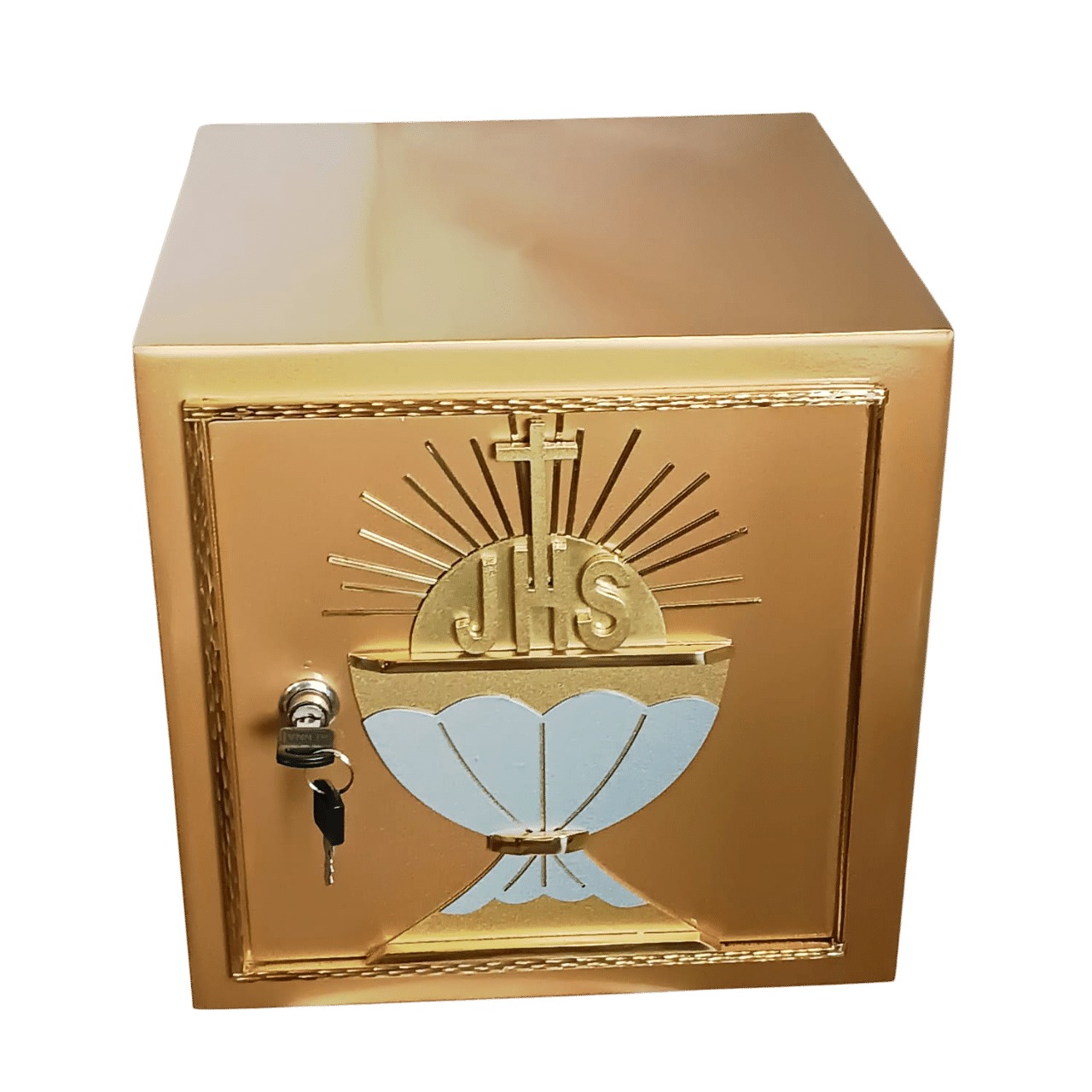 Características: Opção econômica, mais leve e acessível, com detalhe de um cálice e a hóstia consagrada na porta para simbolizar a presença de Cristo pela Eucaristia. Protegido com verniz especial para maior durabilidade.