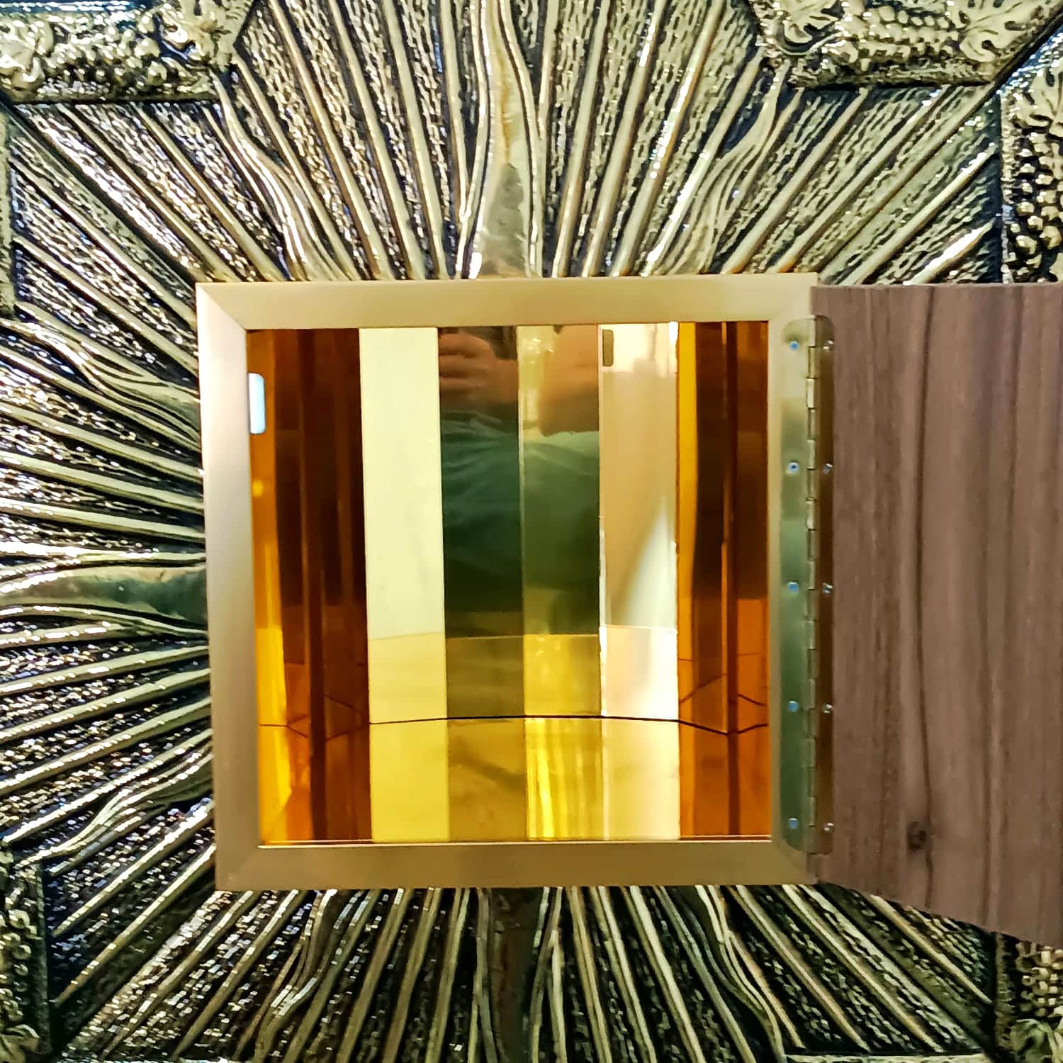 Ideal para embutir em retábulos, altares ou estruturas litúrgicas, conferindo beleza, reverência e proteção ao Santíssimo Sacramento.