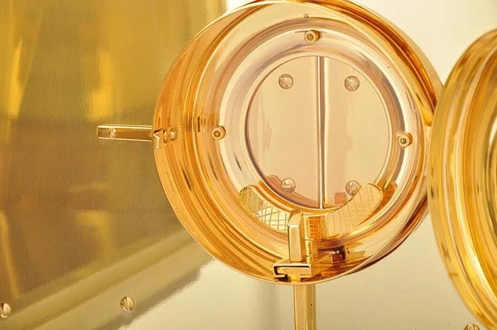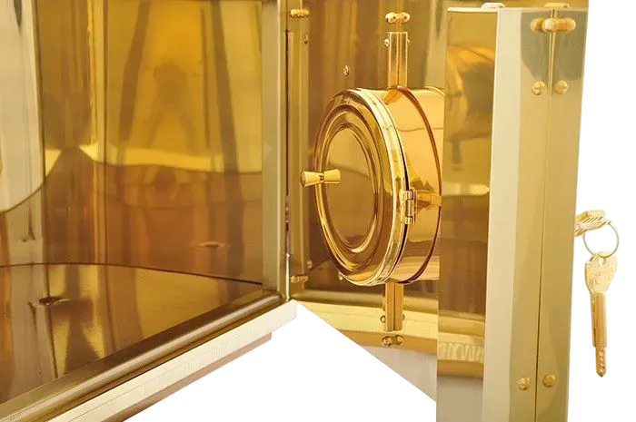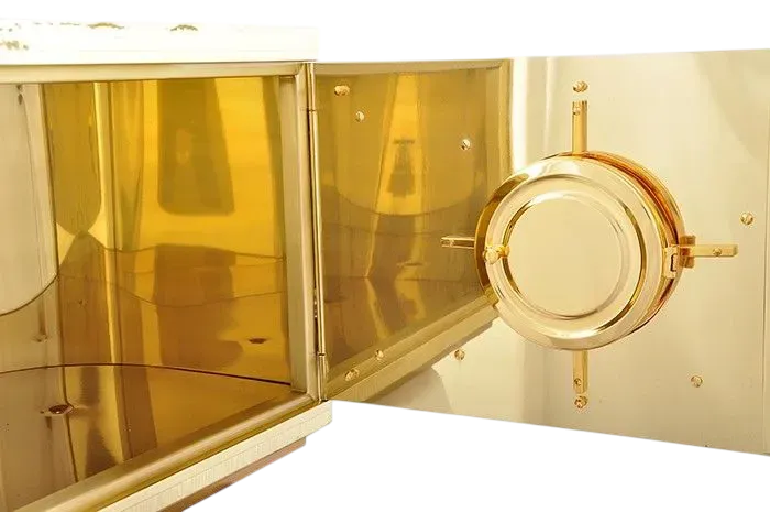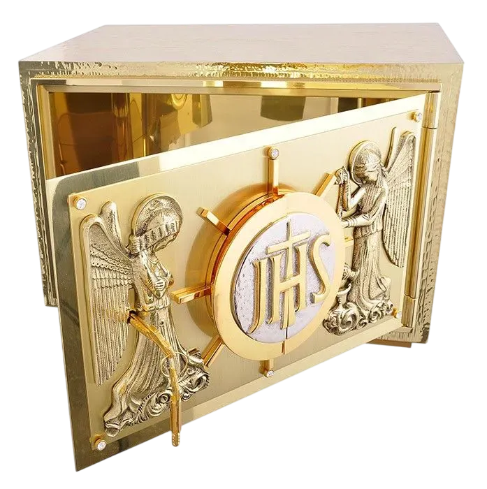 Fabricado em latão dourado com aplique frontal e pedras semi-preciosas. Esse sacrário possui expositor com luneta para hóstia de 10 cm e acompanha um par de chaves.