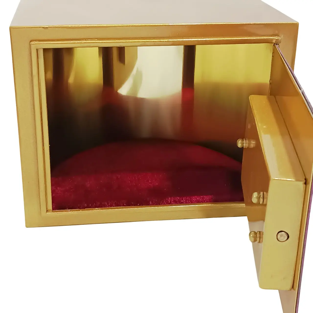 Produzido em metal de alta qualidade, com fino acabamento dourado. Possui design clássico e imponente, trazendo harmonia entre beleza e reverência para a guarda do Santíssimo Sacramento.