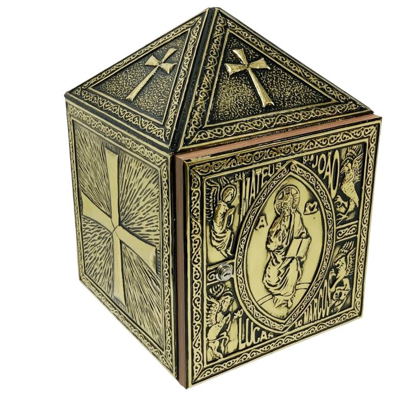 Tabernáculo litúrgico em formato piramidal, confeccionado em madeira e revestido interna e externamente com metal cinzelado artesanalmente. A peça traz detalhes em alto-relevo com representações sacras dos quatro evangelistas – Mateus, Marcos, Lucas e João – além do Pantocrator no centro. Produzido com a tradicional técnica chilena de cinzelar o metal, oferece um acabamento único e sofisticado.