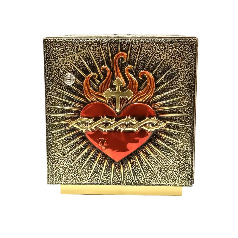 Características: Opção econômica, mais leve e acessível, feito em madeira, com chapa de metal cinzelada a mão, detalhe do Sagrado Coração na porta para simbolizar a presença de Cristo pela Eucaristia. Protegido com verniz especial para maior durabilidade.