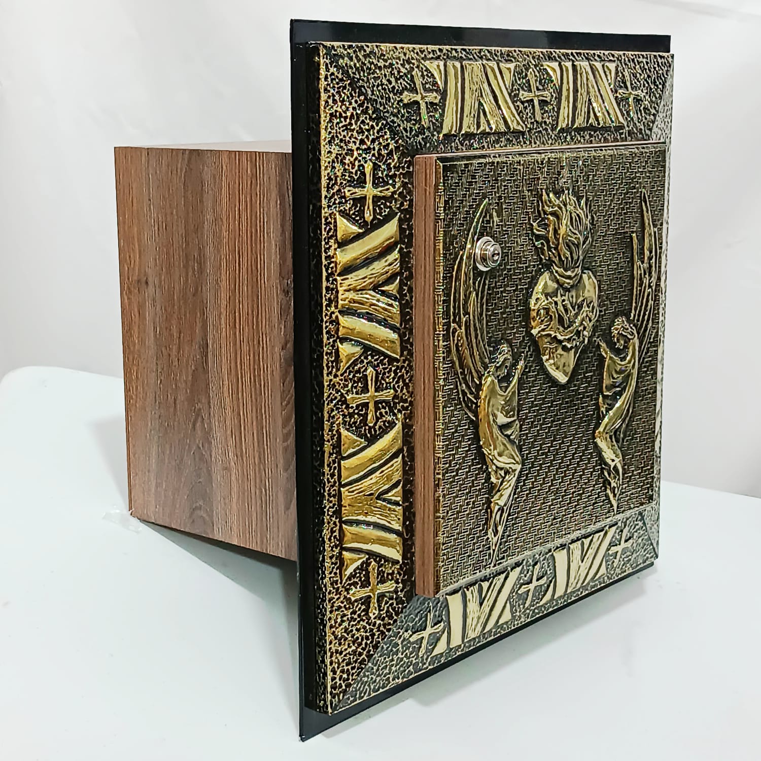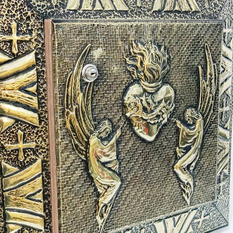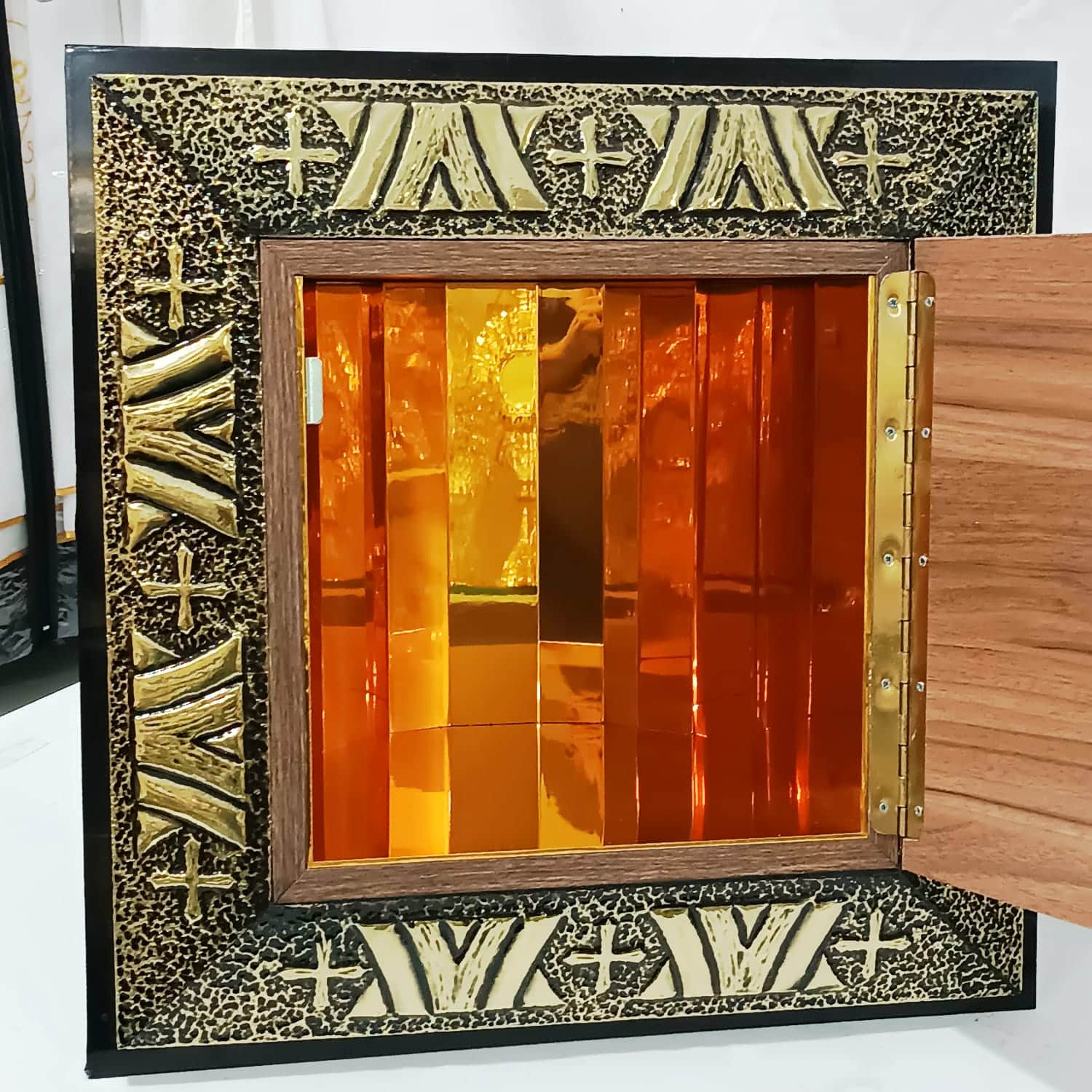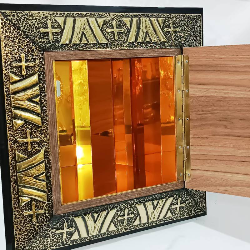 Sacrário de embutir confeccionado em madeira e revestido por dentro e por fora com metal finamente cinzelado à mão. Na porta, a imagem do Sagrado Coração de Jesus irradia luz e devoção, cercada por símbolos eucarísticos como uvas e espigas, todos moldados em alto-relevo com riqueza de detalhes.