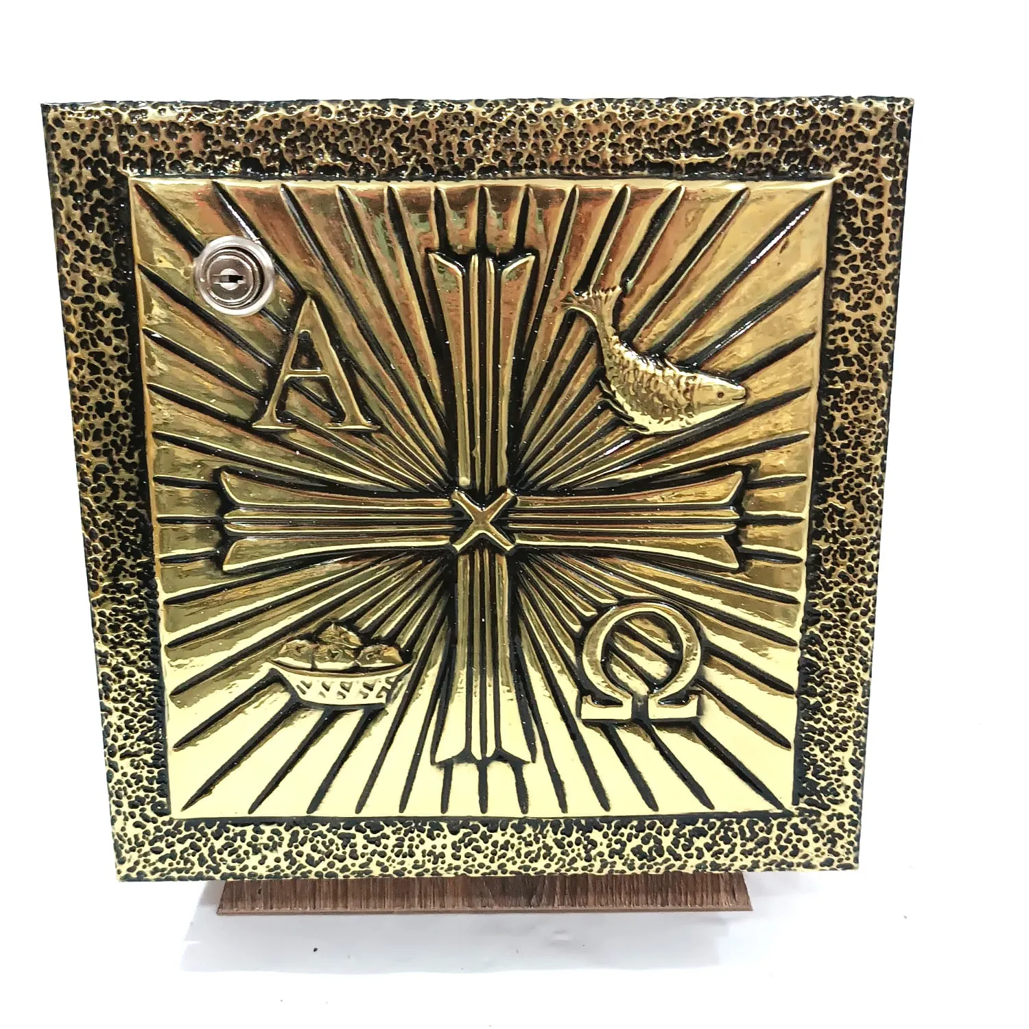 Sacrário produzido em madeira, com revestimento de metal. Interior também com revestimento de metal.