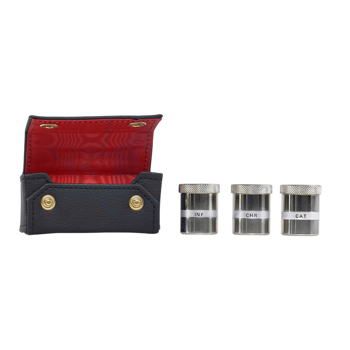 O estojo é completo com três frascos para Óleos Sagrados em latão prateado, com adesivo termoformado INF-CHRIS-CAT.