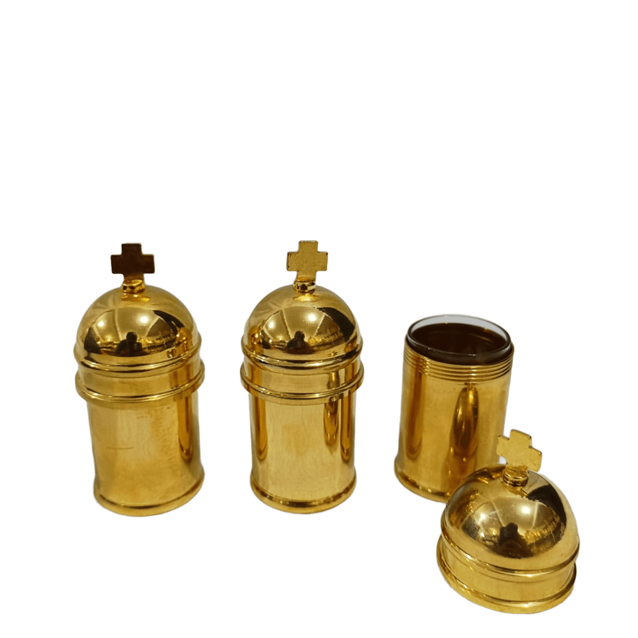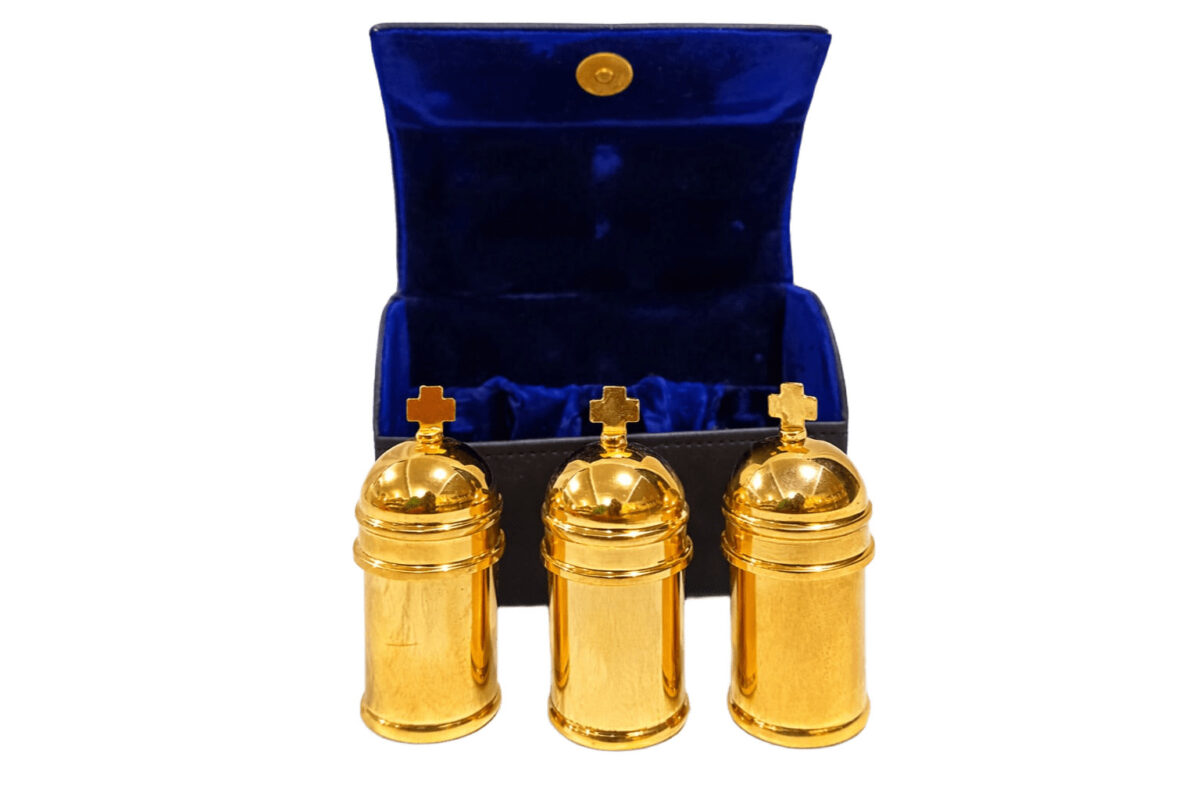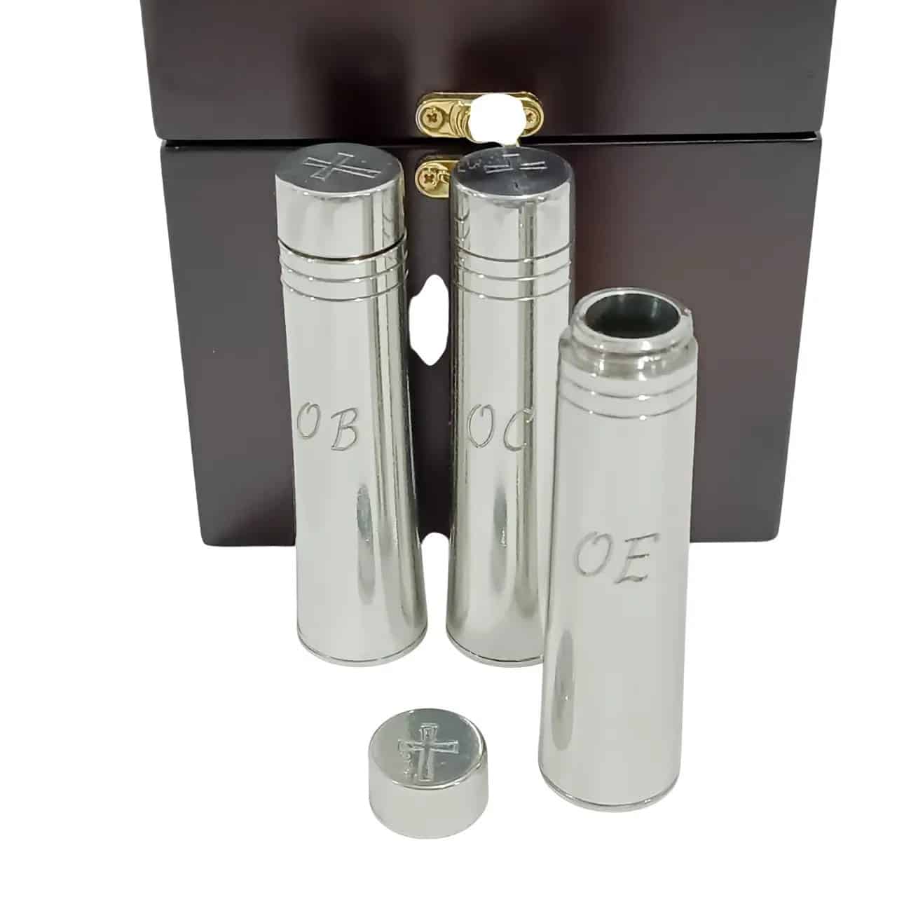 O fechamento dos vasos é com rosca e a capacidade é de 50 ml cada (OE – Enfermos / OC – Crisma / OB – Batismo). – Ø 2,9×6 h. cm