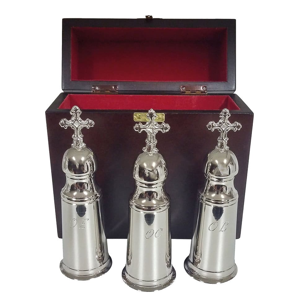 Os vasos para os santos óleos ou crismeiras podem ser de duas formas: os maiores e os menores. Os santos óleos (crisma, catecúmenos e enfermos) são abençoados na missa do crisma, que é celebrada na quinta-feira santa presidida pelo bispo. Nessa missa utilizam-se os vasos maiores (ânforas com capacidade de conter até alguns litros de óleo de oliva), e após esta celebração, os óleos são armazenados em vasos menores e levados pelos párocos às diversas igrejas da diocese para serem utilizados na celebração dos sacramentos (crisma, batismo e unção dos enfermos).