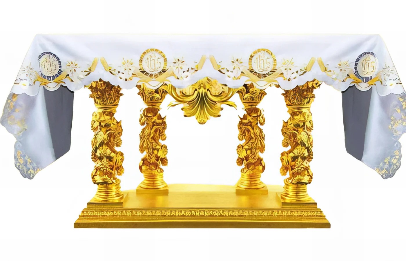 Toalha do altar com bordado de altíssima qualidade. A Toalha Bordada Eucaristia é feita de poliéster superior e resistente a manchas, garantindo beleza e durabilidade para qualquer altar, seja ele de madeira ou de pedra.