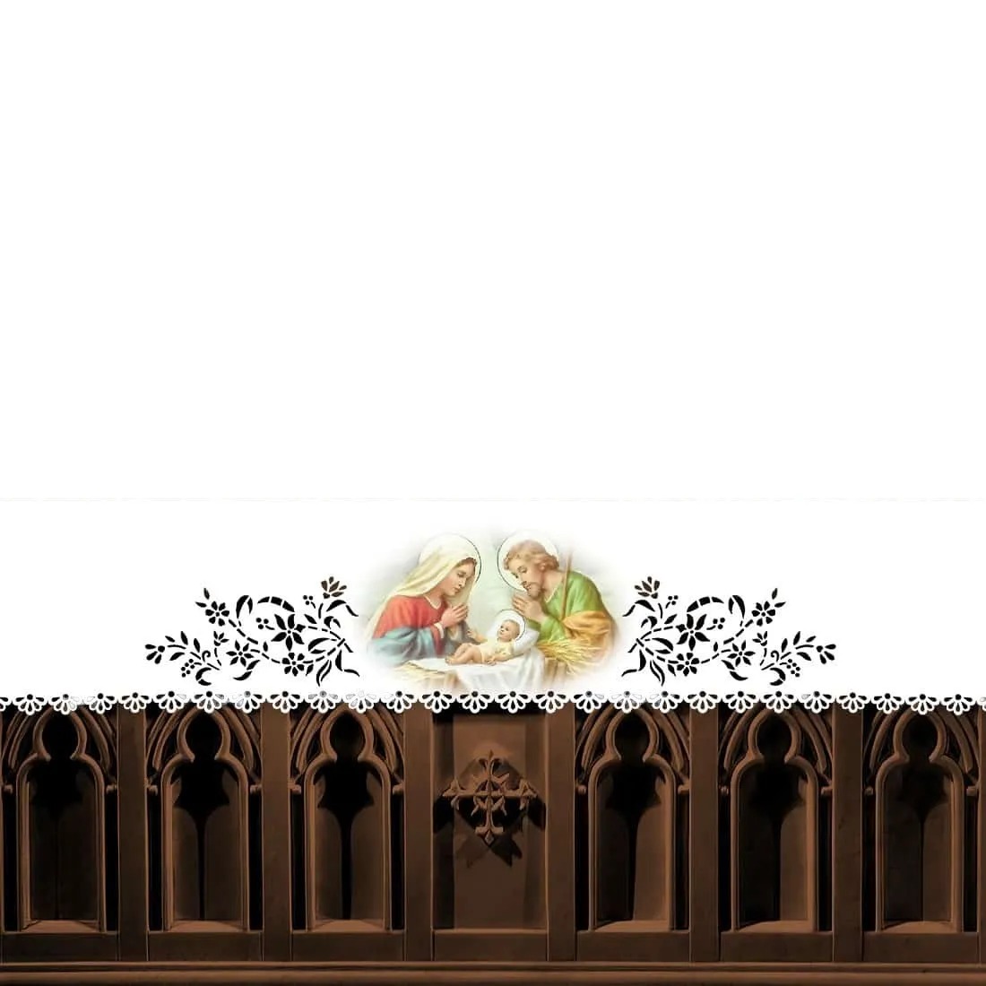 Toalha do altar de altíssima qualidade. A Toalha de Altar Sagrada Família é feita de poliéster superior e resistente a manchas, garantindo beleza e durabilidade para qualquer altar, seja ele de madeira ou de pedra.