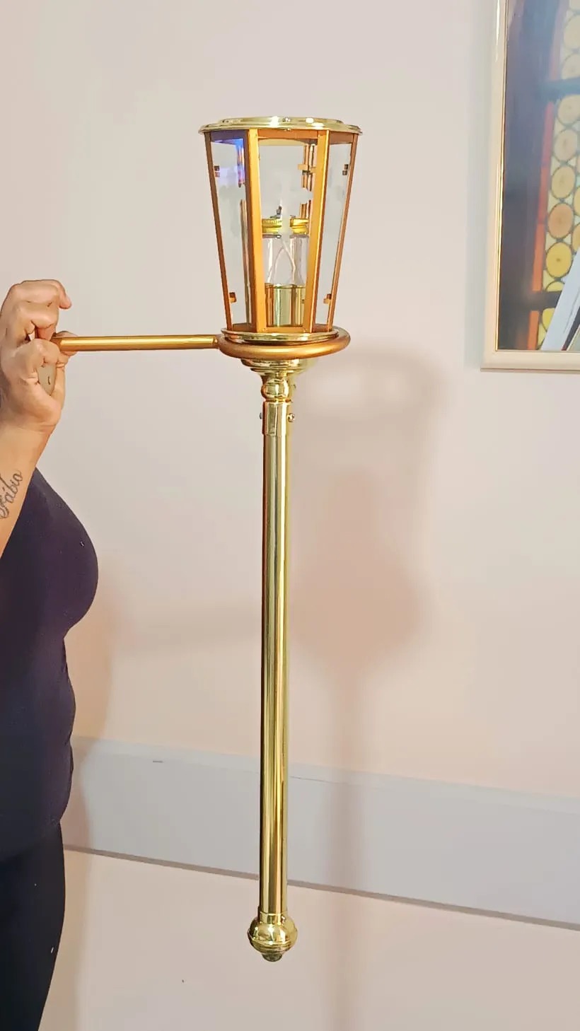 Leve, prática e econômica, esta tocha é ideal para uso litúrgico, especialmente por coroinhas. Funciona com fluido, oferecendo maior durabilidade e facilidade de manuseio em comparação às tochas tradicionais de vela.