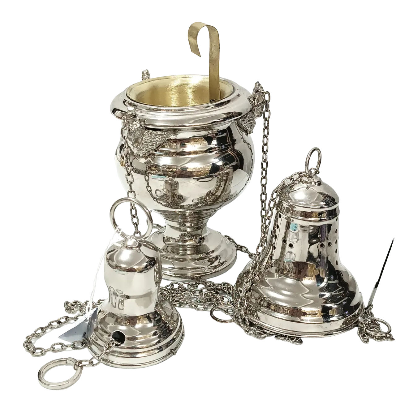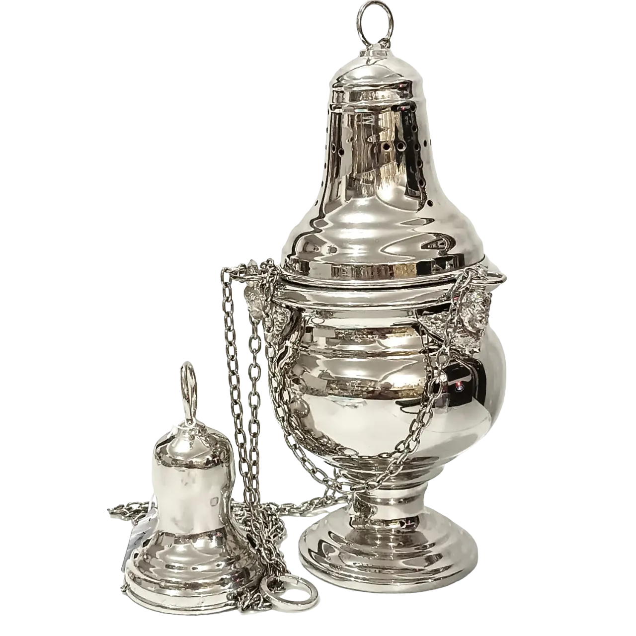 Turíbulo simples confeccionado em latão, com banho de níquel especial que garante maior proteção e durabilidade. O design conta com o aplique de três anjos barrocos presos às correntes, que são mais grossas, proporcionando uma excelente sonoridade durante o uso. O turíbulo possui um recipiente maior para carvão e incenso, permitindo a queima de uma quantidade mais significativa de incenso.