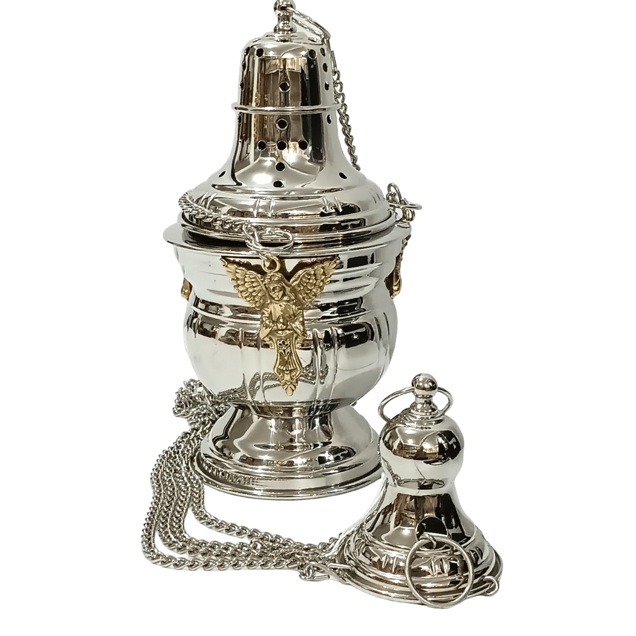 Turíbulo Grande Niquelado 3954. Produzido em metal, com banho niquelado e detalhes em dourado.
