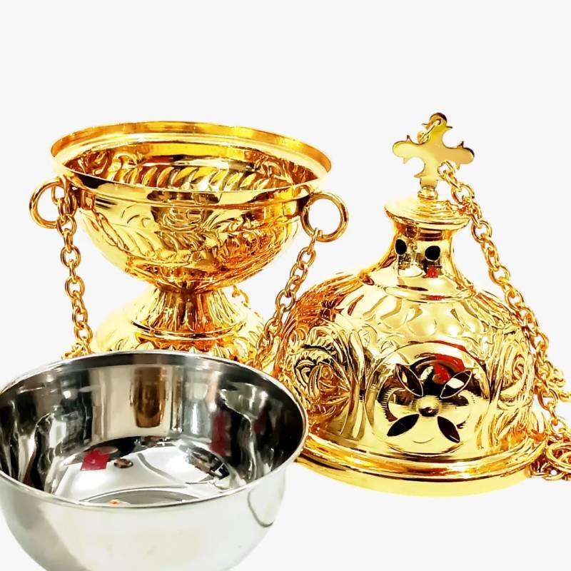 Turíbulo Pequeno Trabalhado – Dourado feito em metal e cinzelado a mão, com banho niquelado especial, produto de ótima qualidade.