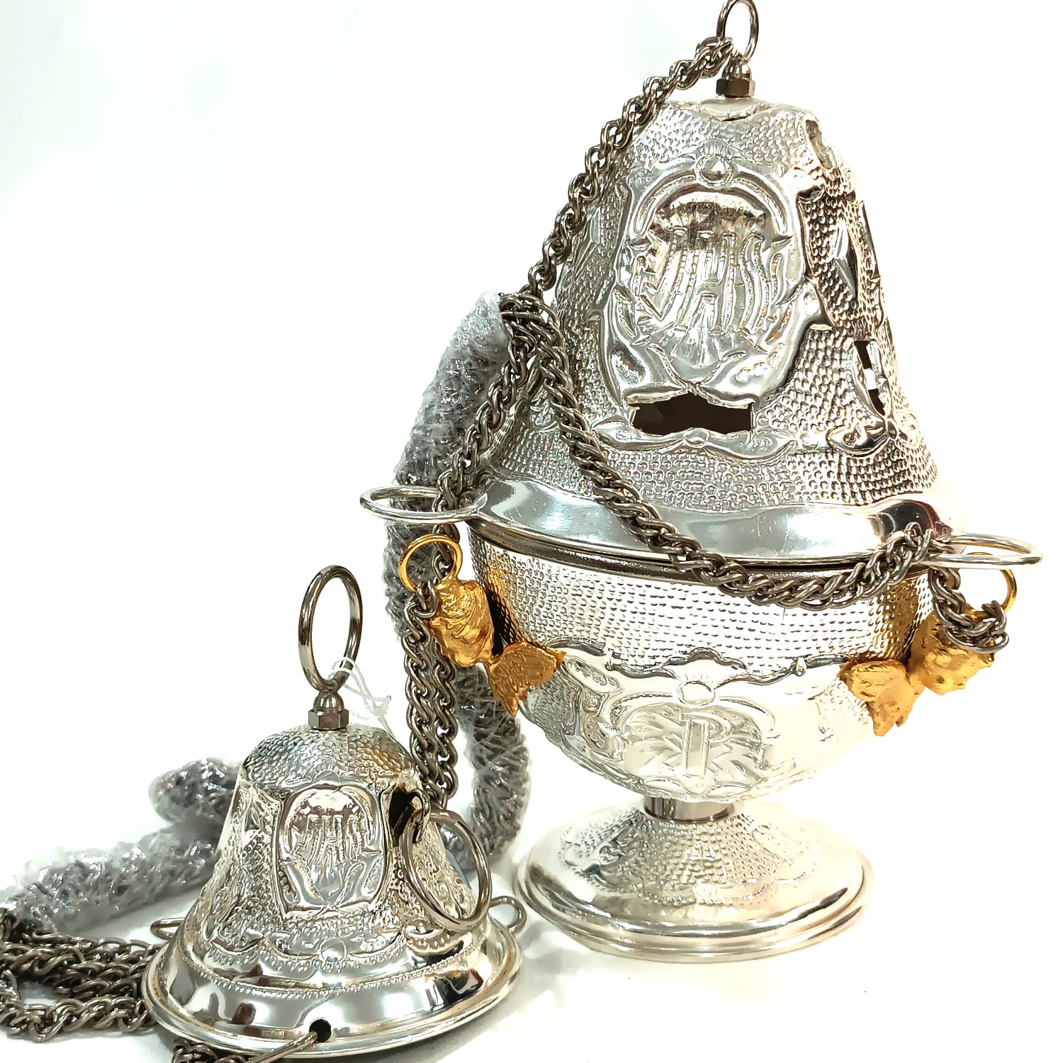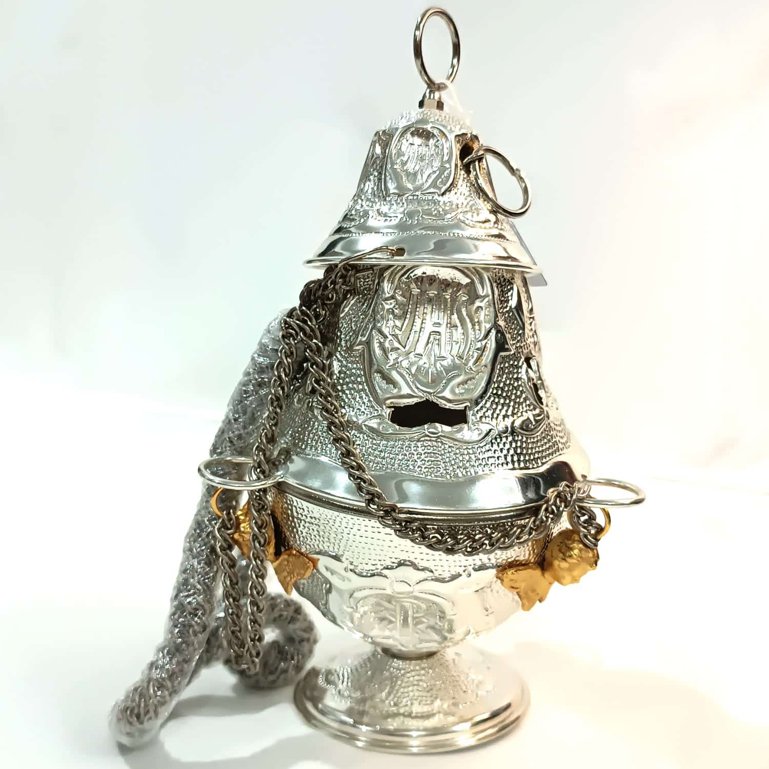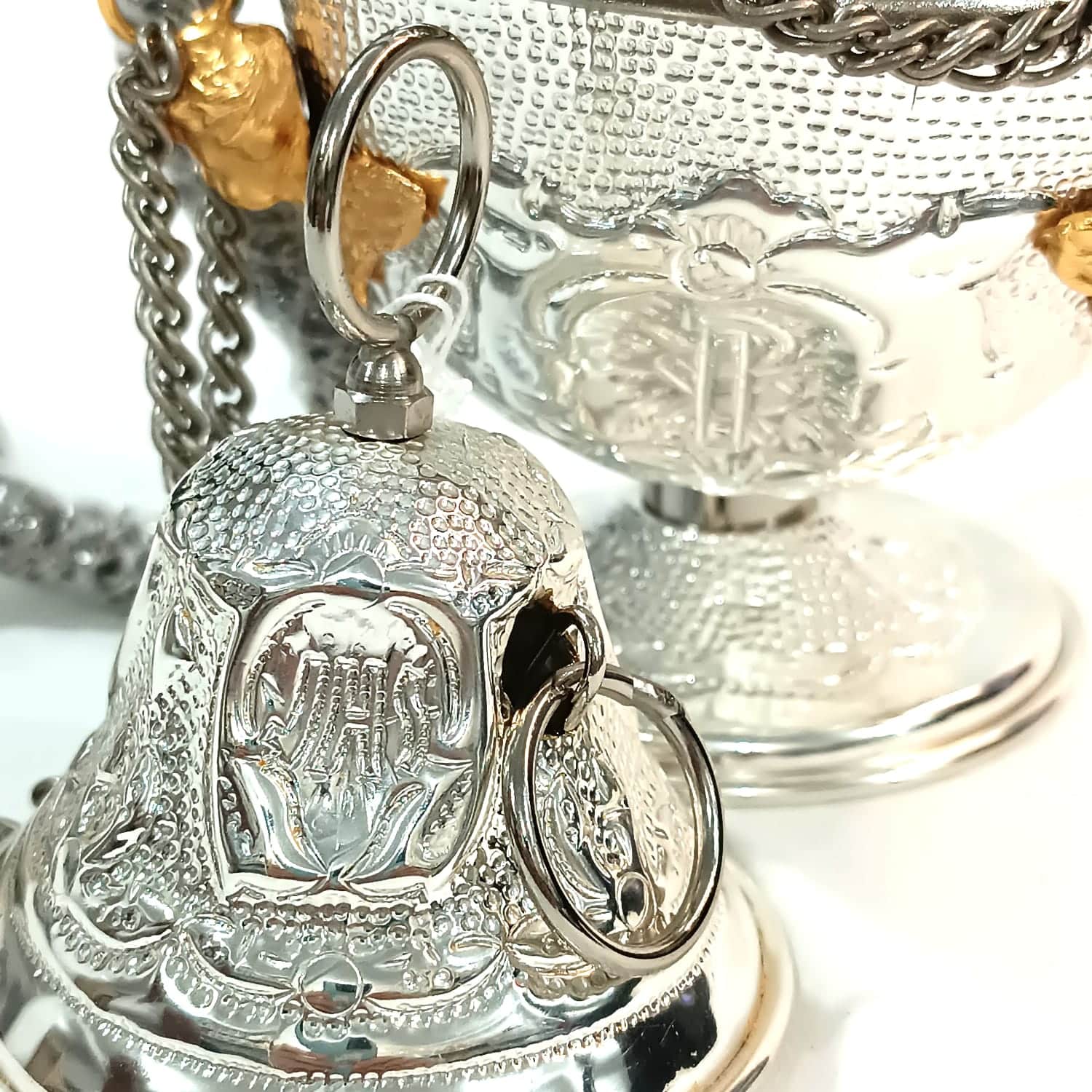 Turíbulo italiano – Altura 23 cm, diâmetro 134cm, diâmetro interno 12 cm, diâmetro da base 8 cm e comprimento da corrente 80 cm