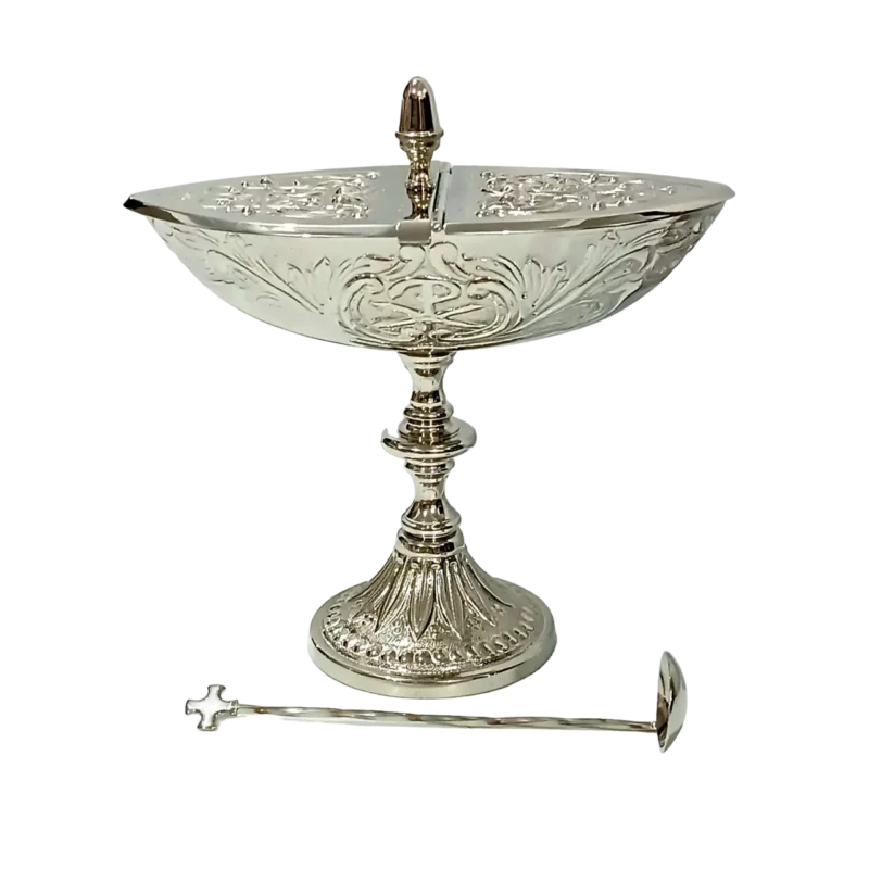 Turíbulo tu05 – Altura 27 cm, diâmetro 13,5cm, diâmetro interno 12 cm, diâmetro da base 8 cm e comprimento da corrente 80 cm – inteiramente cinzelado à mão