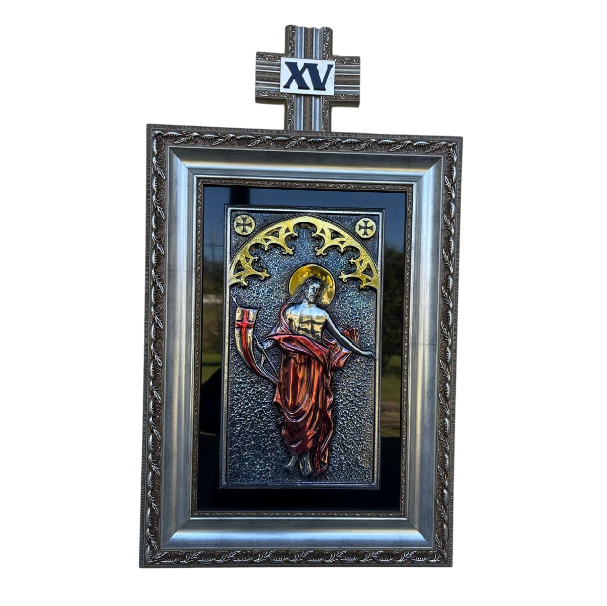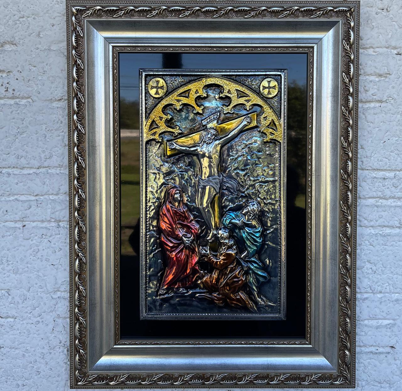 Via sacra com 15 estações, feita em moldura de madeira e acabamento em metal (latão, cobre ou/e latão). Arte de chilena de latonagem. Bela, leve e prática